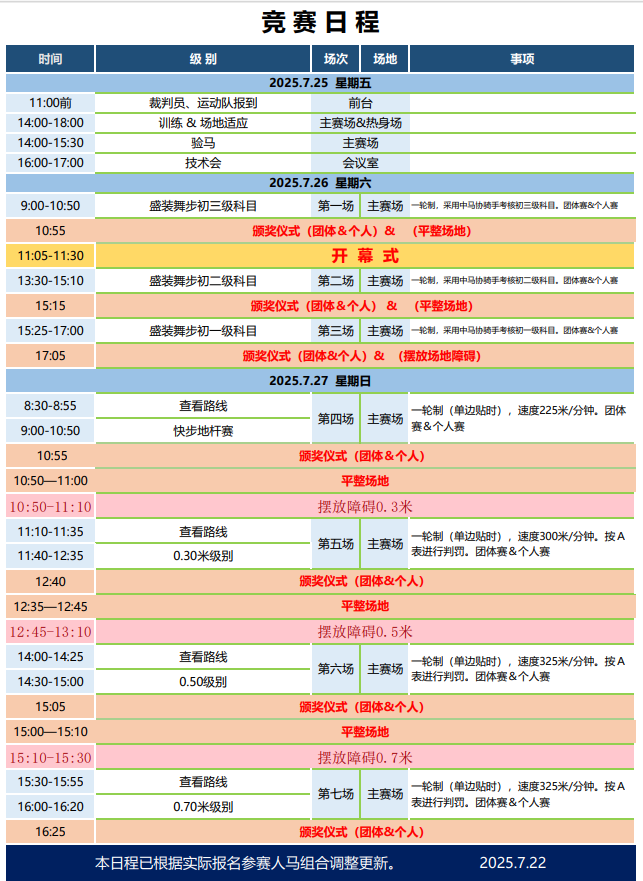 本站比赛设盛装舞步与场地障碍两大竞赛项目。涵盖多个级别,为不同水平的青少年骑手提供了全方位的竞技舞台。在盛装舞步项目中,设有中马协骑手考核初三级科目(团体、个人赛)、中马协骑手考核初二级科目(团体、个人赛)以及中马协骑手考核初一级科目(团体、个人赛)。场地障碍项目则包括快步地杆赛(团体、个人赛)、0.30米级别(团体、个人赛)、0.50米级别(团体、个人赛)以及0.70米级别(团体、个人赛)。
