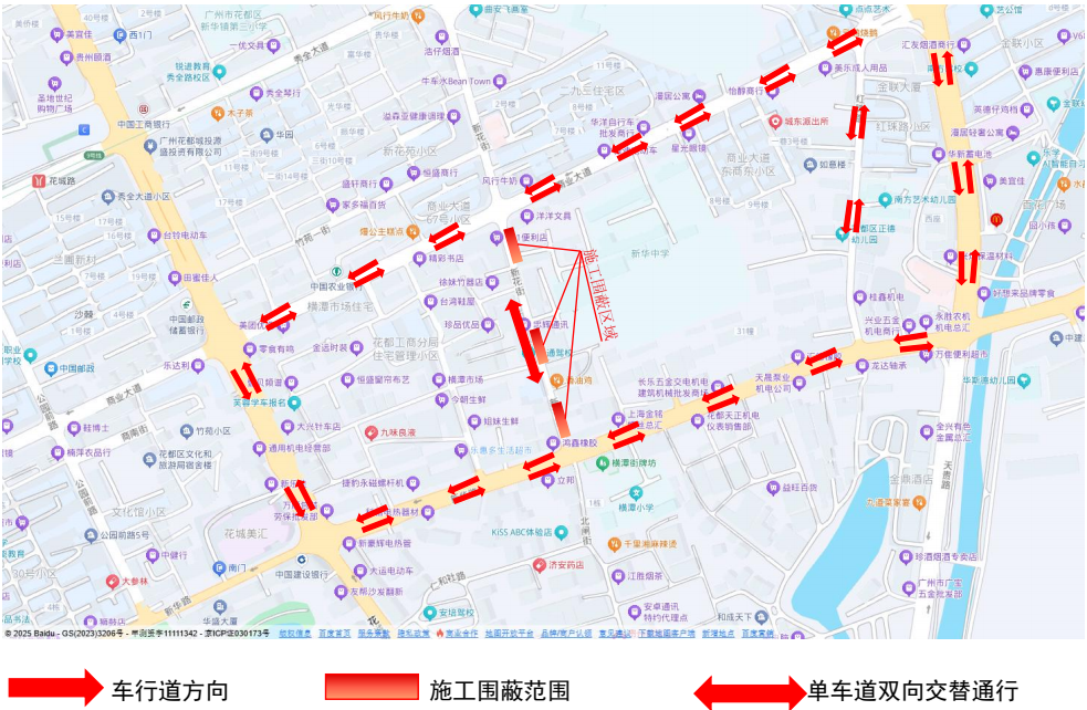 因广州市新华街道城镇污水处理配套管网建设工程施工需要横跨新花街进行管网接驳,为确保施工期间道路交通安全和工程质量,经协调相关单位意见后,2025年7月31日至2025年8月20日对新花街(新华路-商业大道)机动车道进行围蔽施工,施工过程中,占用半幅道路,剩余单车道交替通行,施工完成恢复通车后,在进行剩余半幅道路施工,车辆请提前从商业大道⇔花城路⇔新华路⇔天贵路进行绕行,请沿路各单位、企业和居民提前做好生产和生活安排,因施工造成的不便,敬请谅解和支持。