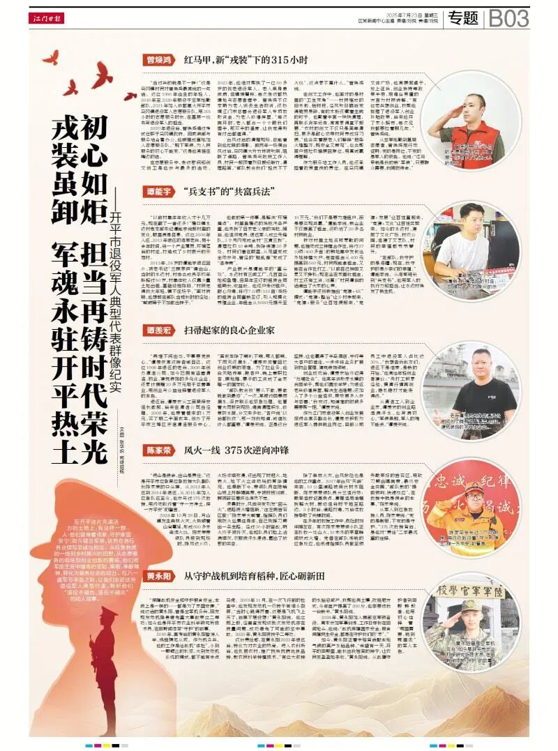 在开平这片充满活力的土地上,有这样一群人:他们曾身着戎装,守护家国安宁;如今褪去军装,依然在各行各业续写忠诚与担当。从应急救援的一线到乡村振兴的田野,从志愿服务的现场到创业创新的赛场,他们将军旅生涯中锤炼的坚韧、果敢、奉献精神,转化为服务社会的动力。在八一建军节来临之际,让我们走近这些退役军人典型代表,聆听他们“退役不褪色、退伍不褪志”的动人故事。