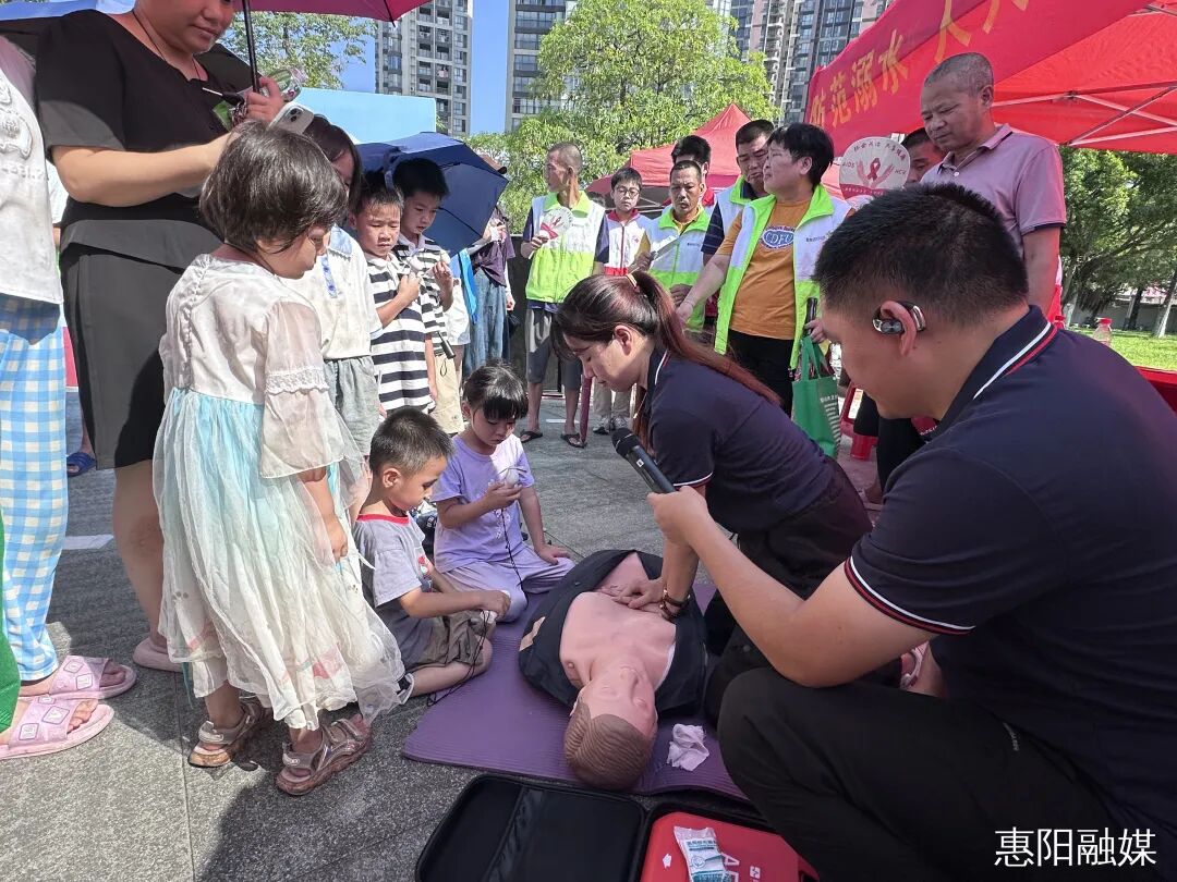 活动现场人头攒动,各区域分工明确又相互联动,形成沉浸式安全宣教场景。在防溺水安全知识教育区,工作人员通过悬挂宣传横幅、摆放案例展板、发放图文手册等方式,聚焦“野外水域风险”“未成年人看护”等重点,用真实案例警示溺水危害。心肺复苏(CPR)模拟教学区成为全场焦点。医护人员先是结合溺水急救场景,现场演示胸外按压的位置、力度、频率,以及人工呼吸的规范操作,清晰讲解“判断意识—呼救—胸外按压—开放气道—人工呼吸”的完整流程,并着重提醒大家,“溺水后4分钟是黄金抢救期,正确的CPR能为生命争取时间。”
