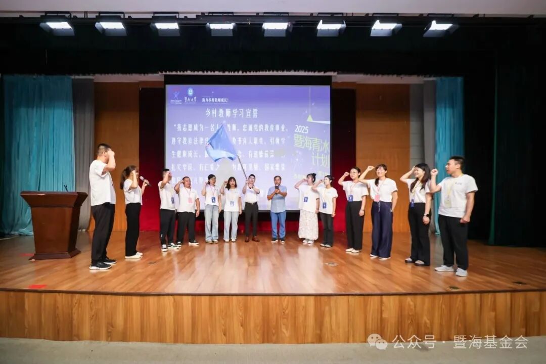 暨海基金会党支部书记李振球携手青冰计划课程总顾问庄健,与王小静老师等12位来自不同地域的教师代表授旗,共同领读教师誓言。