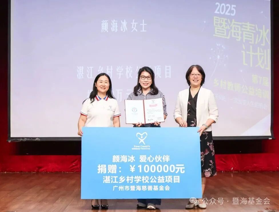 “助力乡村教育振兴不遗余力”。广东省暨南大学发展教育基金会理事会常务理事颜海冰,为湛江乡村学校公益项目捐赠10万元人民币。刘晓瑞理事长和陈莹副书记共同颁发捐赠证书和感谢状,感谢颜海冰女士对乡村教育的大力支持。