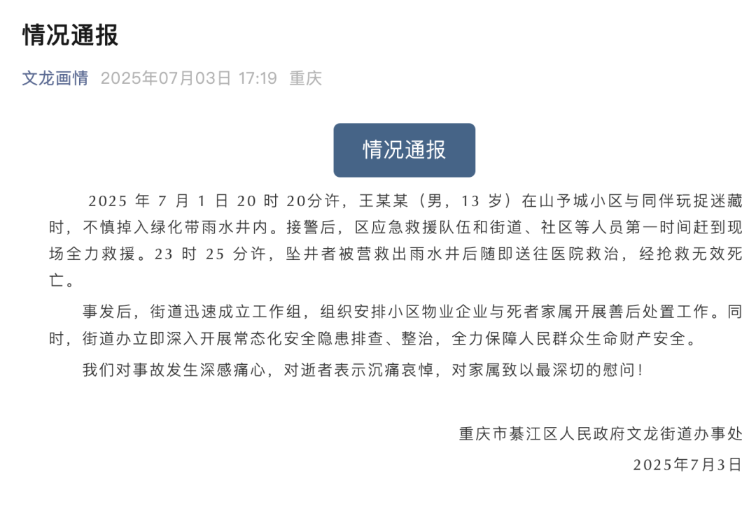 7月1日20时20分许,王某某(男,13岁)在山予城小区与同伴玩捉迷藏时,不慎掉入绿化带雨水井内。接警后,区应急救援队伍和街道、社区等人员第一时间赶到现场全力救援。23时25分许,坠井者被营救出雨水井后随即送往医院救治,经抢救无效死亡。