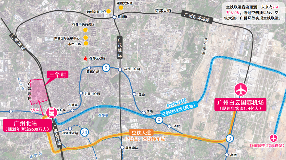 从交通区位看,三华村位于广州北站片区的核心板块,通过空侧捷运线、空铁大道、广州东环城际等实现空铁联运,拥有空铁双枢纽联动客流。三华村紧邻广州北站,是北站新城未来重要的文旅产业核心。三华村的城市更新将带动广州北站新城开发,吸引集聚北站客流,打造北站发展新引擎。