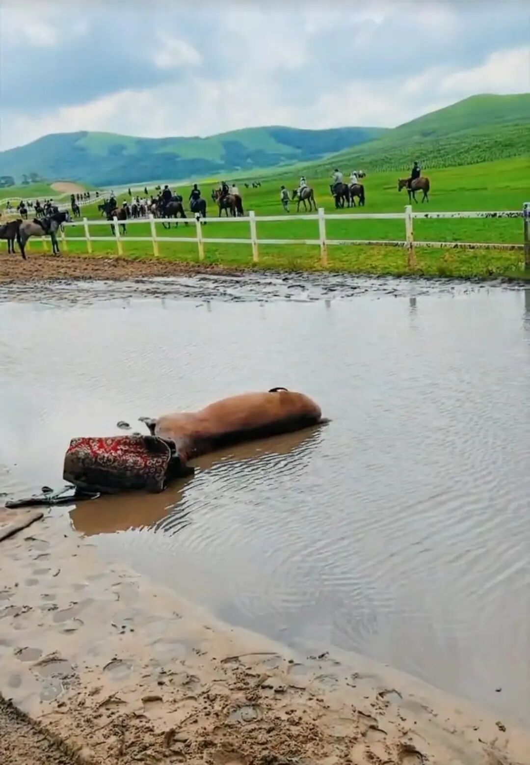 从多名网友和马术俱乐部发布的视频显示,事故发生在泥泞的积水中,一匹马静静地倒在地上,周围是焦急而无奈的人群。视频画面中,三人或蹲或坐在地上,周边还有许多骑马的游客,整个场景显得异常混乱。最终,这匹不幸的马儿被挂在大铲车上拖走,画面令人揪心。