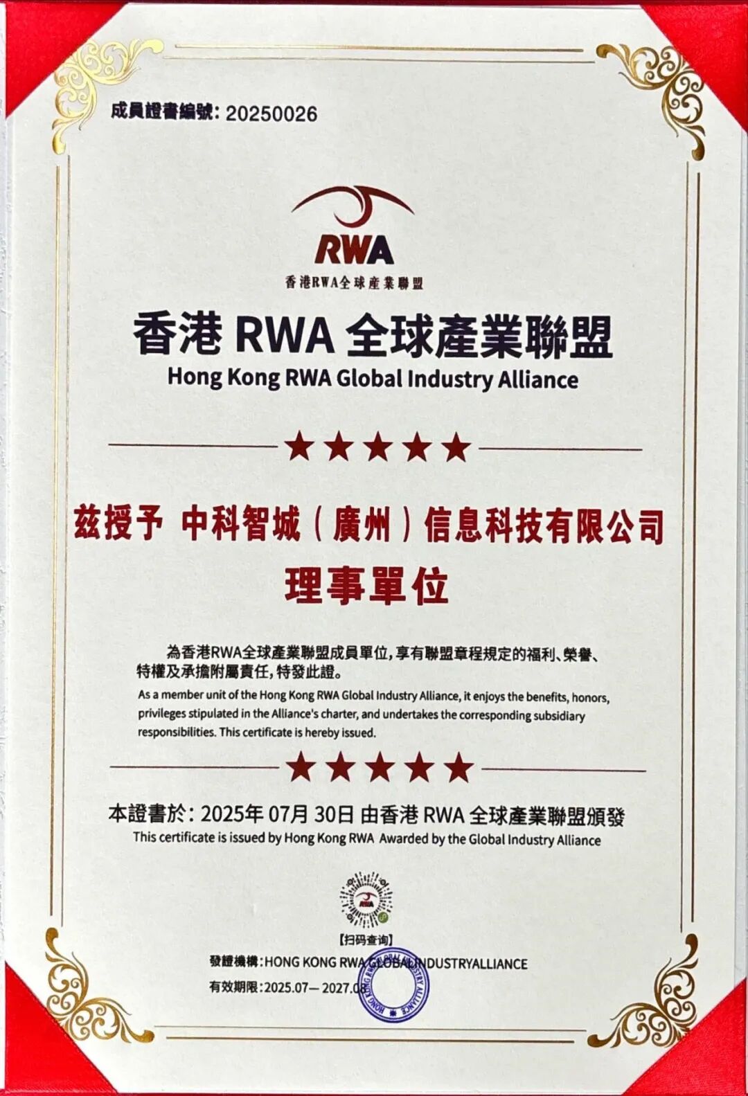 在香港RWA全球产业联盟第一届成员代表大会上,经过提名表决,中科智城被正式授予理事单位称号。与此同时,袁峰博士凭借在区块链技术与产业应用领域的深厚积累,受聘为联盟技术委员会副主任委员,未来将参与RWA行业标准与技术规范的制定。
