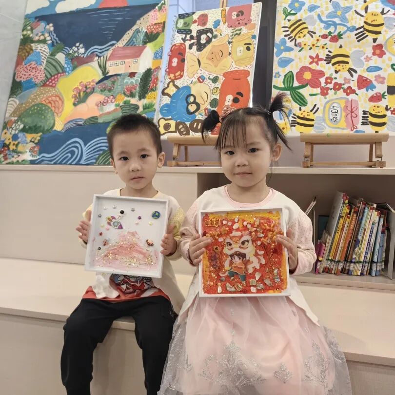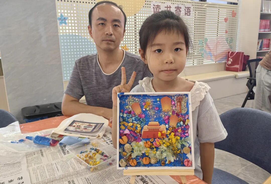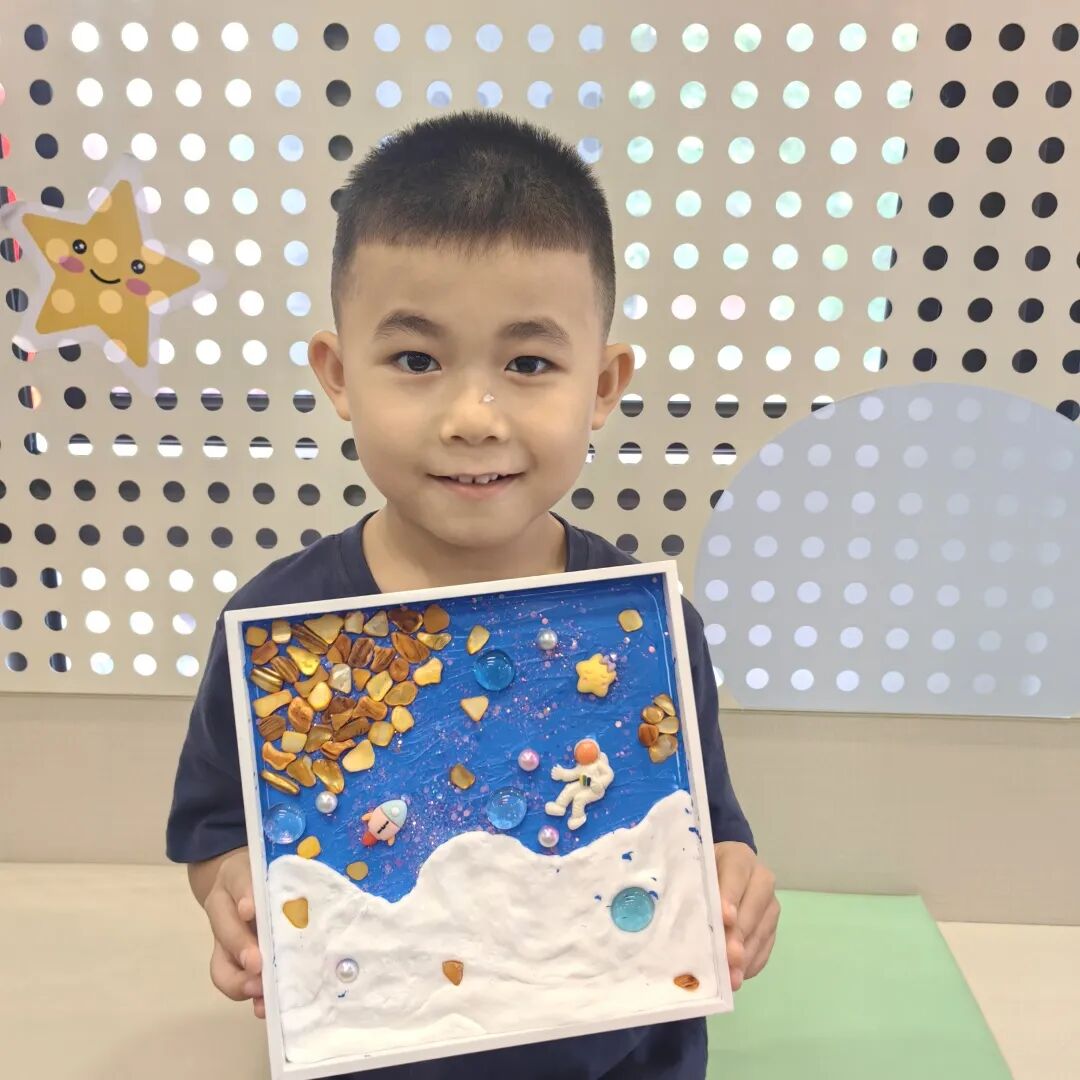 在爱国主义教育环节,妇联工作人员以“国旗的故事”为切入点,从五星红旗的设计寓意、历史背景到升旗礼仪,为亲子们上了一堂生动的“红色课”,孩子们聚精会神地听讲,眼神中充满了对国旗的崇敬之情。随后,亲子家庭共同参与“祖国·航天”主题托画创作——家长协助调配颜料,孩子们用稚嫩的小手在画布上拓印出天安门、火箭、星辰等图案,鲜艳的色彩与童真的笔触交织,勾勒出对祖国的热爱与对航天梦想的憧憬。一幅幅充满童趣的作品陈列展示时,孩子们争相介绍自己的作品,现场洋溢着欢乐与自豪的氛围。