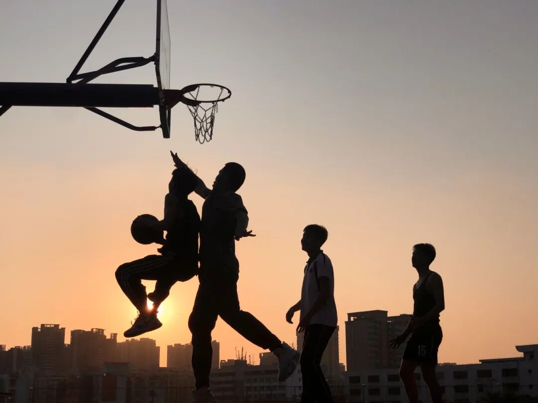 夕阳西下,篮球场上师生同场竞技。场边观战的学生们欢呼雀跃,比分在笑声中交替上升。
