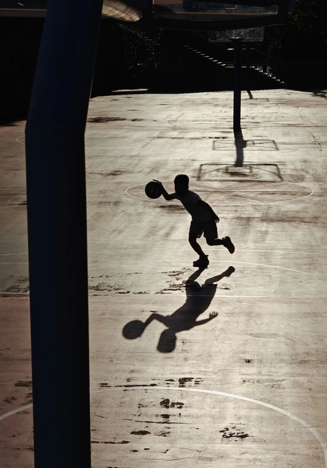 暑假的篮球场上,儿子抱着崭新的篮球,脸上洋溢着兴奋的笑容。他开心地跑跳着,夕阳把他的影子拉得老长。