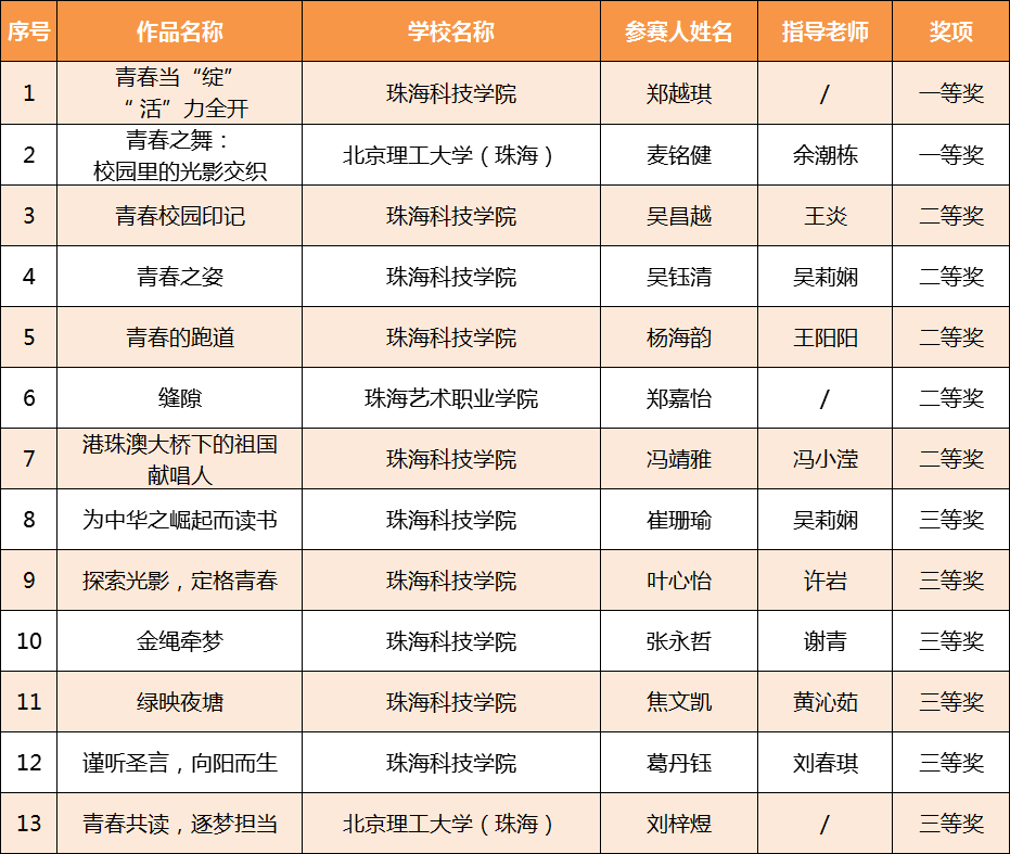近日,由广东省教育厅主办的“青春献礼,挺膺担当”2024年广东省校园摄影大赛结果揭晓,珠海各校师生凭借敏锐的观察力和独特的艺术视角,在众多参赛者中脱颖而出,充分展现了珠海师生的艺术素养和青春风采!