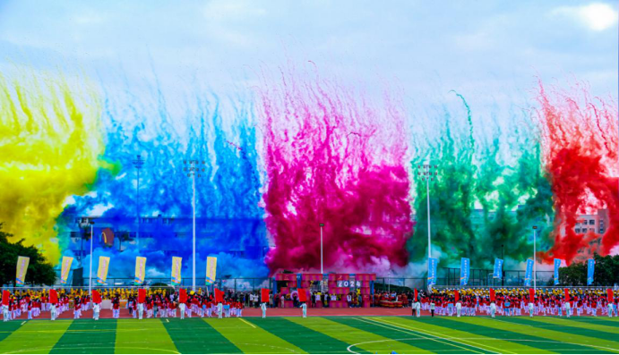 这张照片拍摄在校园运动会开幕式烟花绽放的轰鸣声与现场师生热烈惊呼声的交相辉映中,此情此景所展现的朝气蓬勃、挺膺担当的气氛,正是师生青春与担当最耀眼的具象。它短暂却无比绚烂,如同青春年华,提醒着我们要在最耀眼的年华珍惜时光,奋发努力,为国争光。