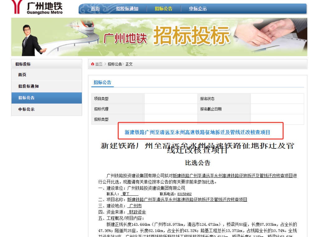 需要注意的是,本次招标范围仅包括广州枢纽至阳山段143.444km(为中国铁设设计范围),另外清远段约100km及湖南段约170km为中铁四院设计范围。