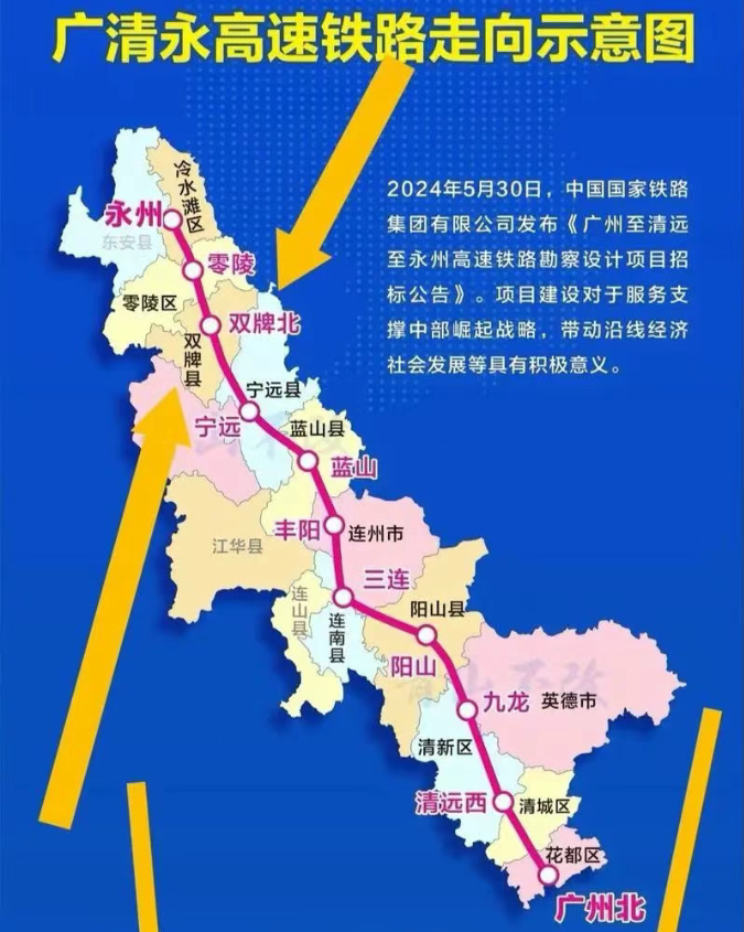 广清永高铁(湖南称“永清广”,广东称“广清永”),全称为广州至清远至永州高速铁路,是国家“十四五”铁路发展规划的重要项目,北起湖南省永州市,向南经清远市,终至广东省广州市北站,全长401.7公里,设计时速350公里/小时。