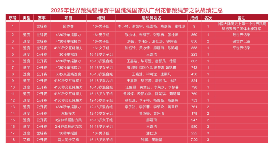 11金4银3铜、打破2次世界纪录、追平1次世界纪录、创下中国大陆历史上第一个世界跳绳锦标赛男子团体全能冠军的成绩,是花都跳绳梦之队实力的最佳证明——他们用稳定的发挥、精湛的技术,在世界舞台上展现了中国跳绳的顶尖水准,更让“花都力量”成为国际赛场不可忽视的光芒。