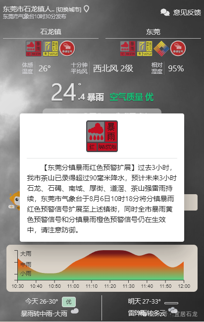 【东莞分镇暴雨红色预警扩展】过去3小时,我市茶山已录得超过90毫米降水,预计未来3小时石龙、石碣、南城、厚街、道滘、茶山强雷雨持续,东莞市气象台于8月6日10时18分将分镇暴雨红色预警信号扩展至上述镇街,同时全市暴雨黄色预警信号和分镇暴雨橙色预警信号仍在生效中,请注意防御。