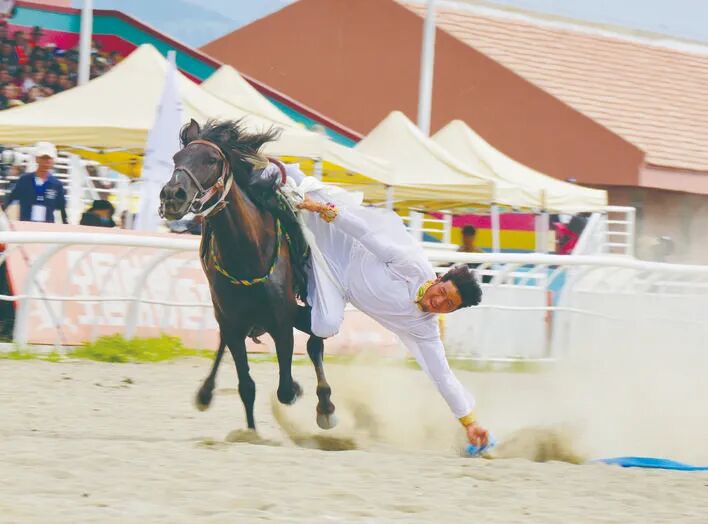 赛场上,各参赛骑手将绝技轮番上演,马背上的身姿稳如磐石,俯身拾哈达时,身体与马身几乎平行,人马配合默契得仿佛一体,马背倒立更是堪称“静态艺术”,骑手们在马背上成倒立姿势,身体与地面保持垂直,马跑过百米赛道,引得现场观众阵阵欢呼。
