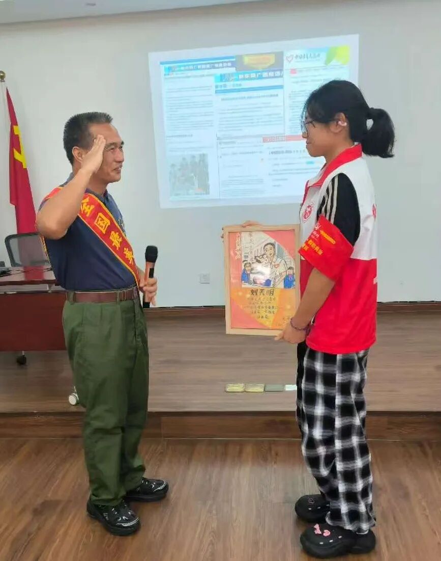 广州市第一中学十甫学校施国楷同学:今天在沙面驿站听刘天明老班长分享了他的故事,让我深受触动。他讲述了自己当兵的经历,虽然立过多次三等功,却因学历问题没能当上将军。但他并没有因此消沉,而是通过志愿服务找到了新的人生价值。 老班长说,志愿服务改变了他,让他感到充实,也让他有机会帮助更多需要帮助的人。他的话让我意识到,人生或许会有遗憾,但只要保持积极的心态,总能找到新的方向。同时,他也提醒我们要珍惜现在的学习机会,不断提升自己。 这次志愿活动让我明白,奉献不仅能帮助他人,也能让自己成长。老班长的故事激励着我,无论未来遇到什么困难,都要坚持努力,为社会贡献自己的力量。