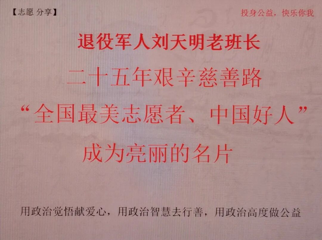 广州中学生潘汶晞 潘汶昕同学: 今天有幸参与沙面志愿者驿站组织的活动,能听到刘天明老班长亲自分享他的老兵故事。 整个分享活动中,令我们印象最深刻的是老班长多次强调的那句:“一定要珍惜学习的机会!”。我们一定会把这句话牢牢记在心中。 非常感谢老班长的分享。他不但身体力行,多年来一直坚持志愿者工作,还勉励我们加入志愿者行列,一起帮助有需要的人,一起回馈社会。 我们一定会以刘天明老班长为榜样,好好学习,坚持参加志愿者活动,做一个有志向,有承担,有爱心的人。
