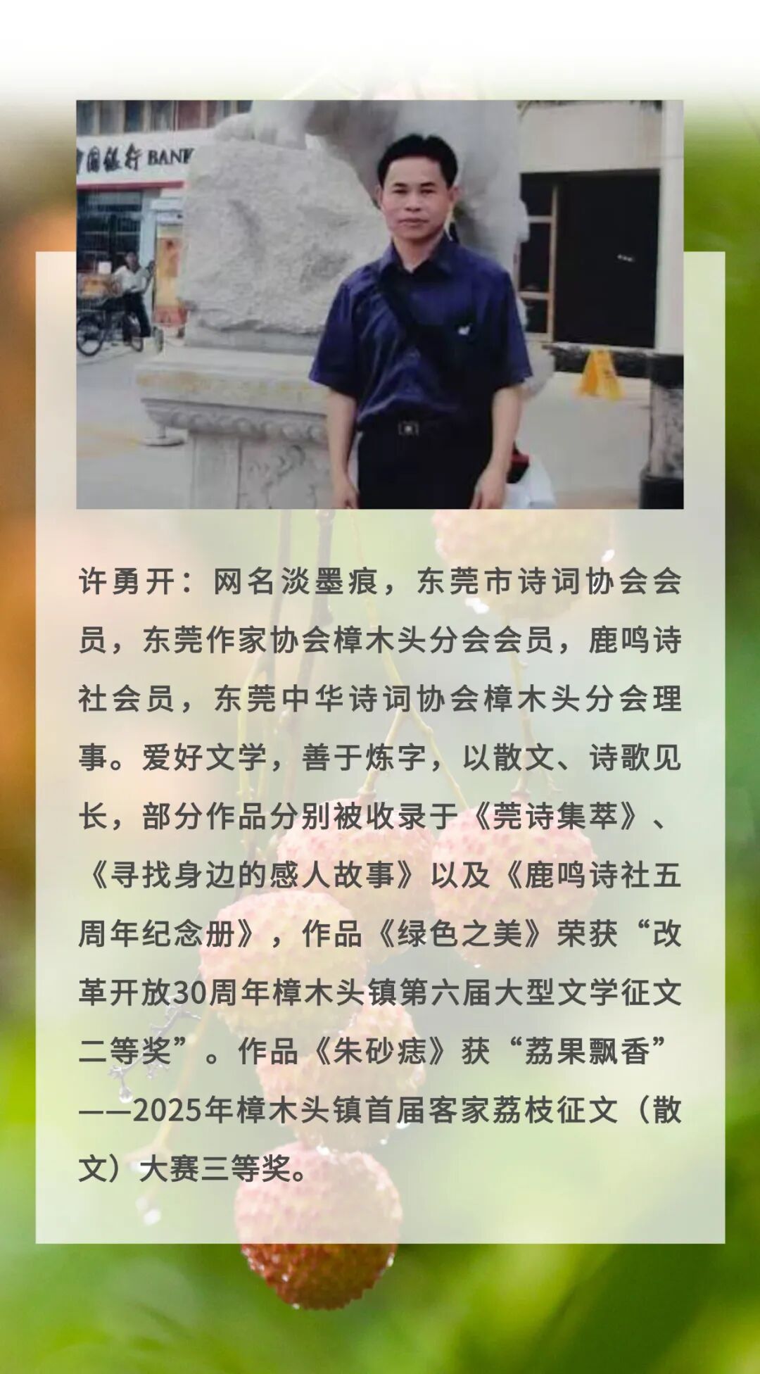 而今每逢荔熟时节,我仍会循着记忆的甜香重返旧林。漫步在熟悉的荔枝树下,阳光透过枝叶洒下斑驳的光影。齿间迸裂的琼浆里,廿载光阴竟化作琥珀色的酒酿。那些在绿云间挥汗的身影,那些盛满竹篮的笑语,早把樟木头的山水酿成了陈年荔枝酒。苏子“不辞长作岭南人”的咏叹,在此刻愈发清晰——原来人与故土的羁绊,本就是粒不会褪色的朱砂痣,相伴一生,无论时光如何流转,这粒痣都将永远镌刻在心底。