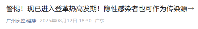 8月12日,广州市疾病预防控制中心微信公众号发文提醒市民:现已进入登革热高发期。