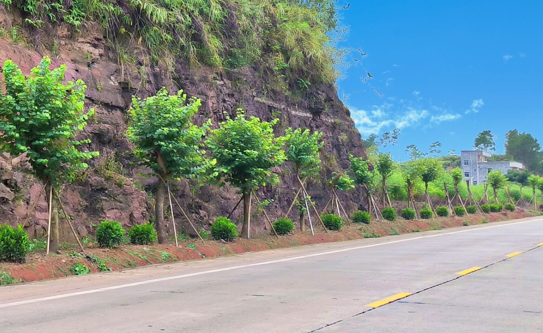 项目以10公里核心路段为轴线,按照“双向拓展、立体呈现”的建设标准,在道路两侧各打造1.5米宽绿化带,形成总长20公里的生态廊道。通过精准配置景观植被,沿线栽植约3800株宫粉紫荆构筑“花海长廊”,同步穿插种植约12万株红继木,形成层次分明的立体景观体系。沿路采用花槽式路沿石设计,在路基防护基础上,通过乔、灌、草复合种植,有机融合黎少农耕文化等乡土元素打造5处特色景观节点,形成春有“紫荆漫舞”、秋现“红木似火”的美景,四季皆成打卡热点。