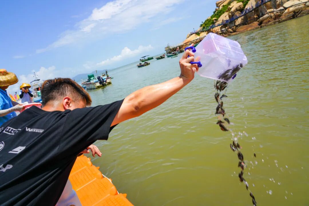 游客亲手放归鱼苗入海,感受生命与海洋的奇妙联结,祈愿风调雨顺,渔获满舱!