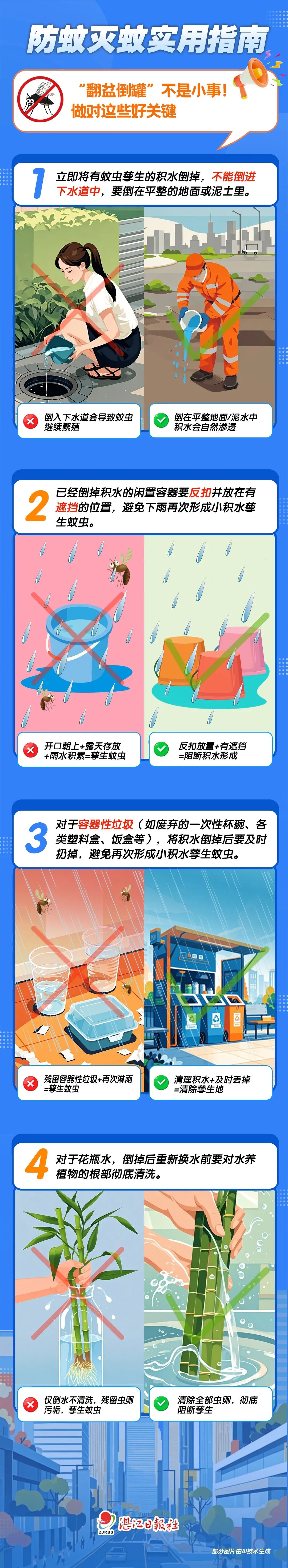 具体动作:仔细检查家中、阳台、小院:清空水养植物的花瓶、容器(至少每周换水刷洗);遮盖好储水容器;处理掉闲置的瓶罐、轮胎等;检查空调排水管、冰箱接水盘、饮水机托盘是否有积水。每日查,隐患拔!