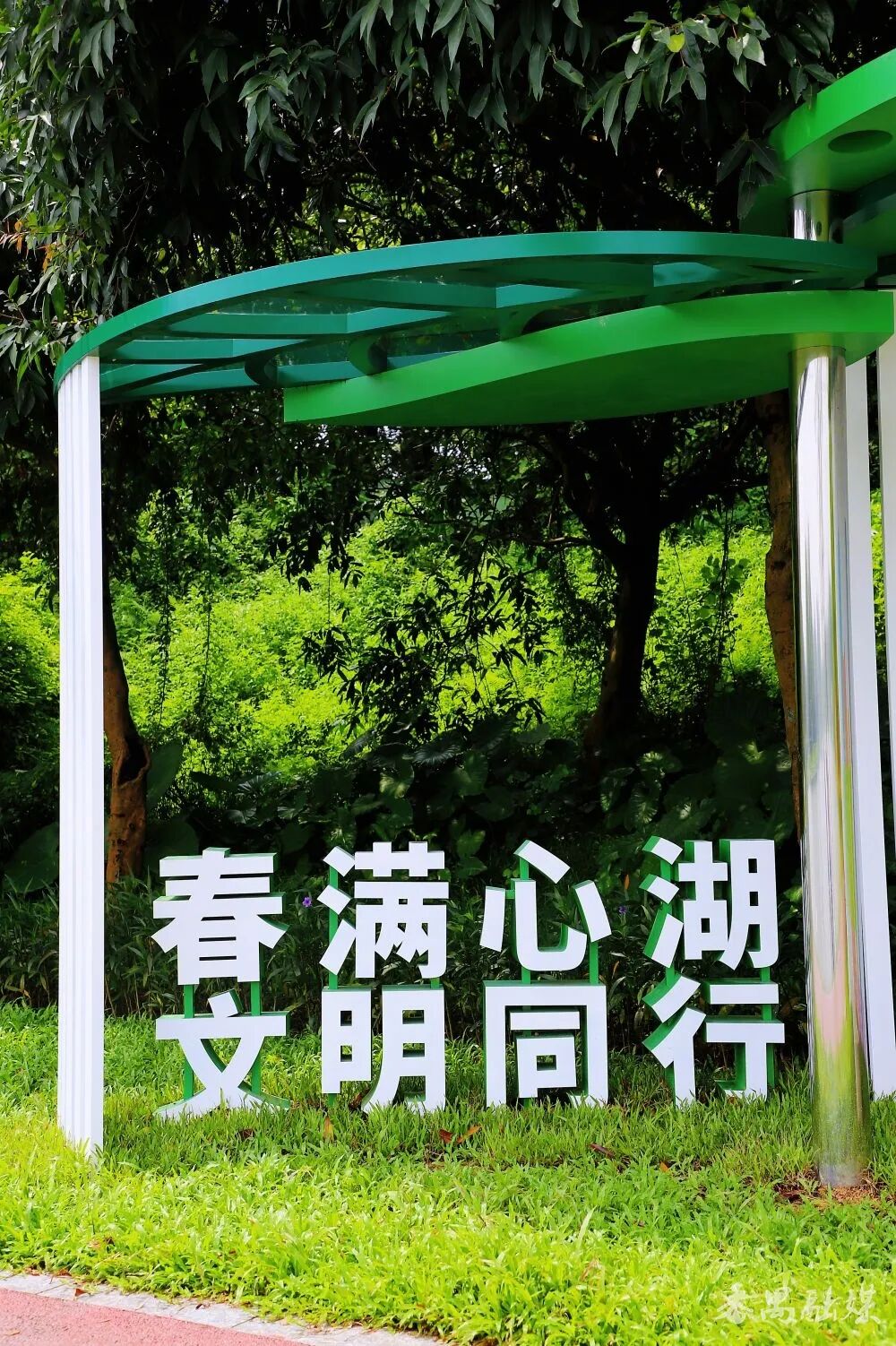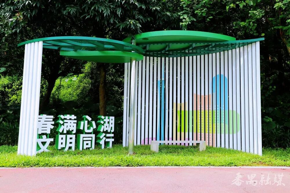 沿湖畔小路继续前行,远远就望见一片“绿叶”撑起的空间,走近才知是“春满心湖”休息驿站。驿站造型清新自然,无数白色的小方柱托起舒展的绿叶顶,阳光从叶片间漏下来,在地面拼接出光影。雨天来躲雨,晴天来歇脚,在“绿叶”之下,感受清风拂面,聆听鸟鸣湖语,疲惫顿消,心旷神怡。