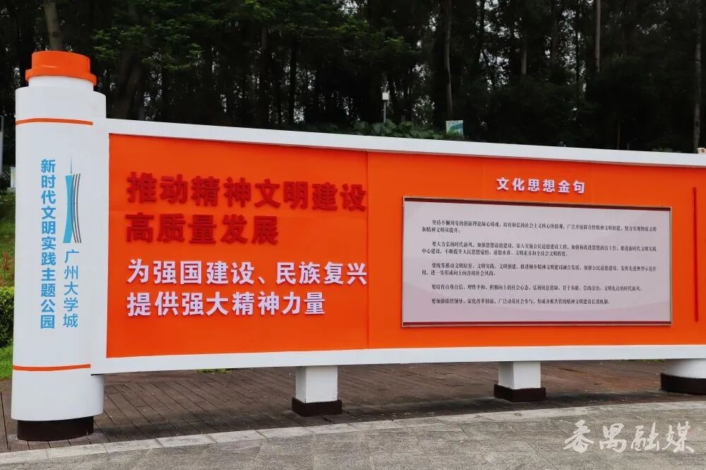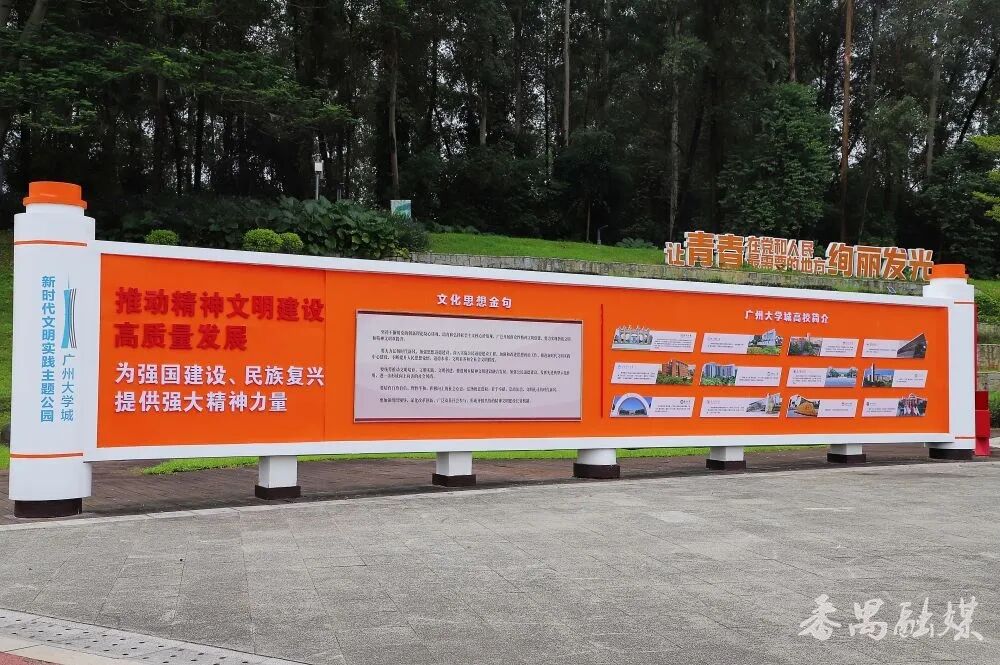 人才广场中心,卷轴式的宣传栏缓缓“展开”。其间内容精选了精神文明建设的金句,并图文并茂地展示了广州大学城12所高校的特色亮点。图文交织间,像在翻阅一本写满“行动”的教科书,字里行间都是精神文明建设的答案。