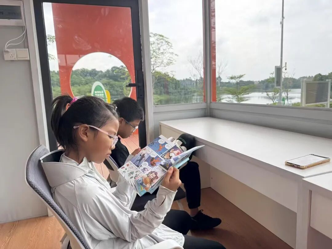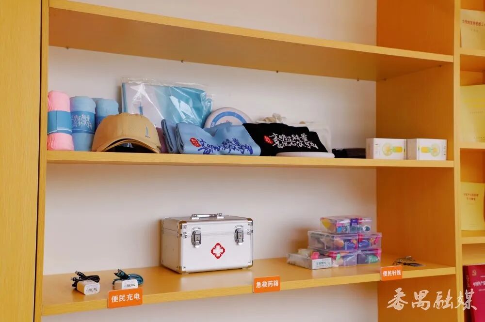步入驿站内部,书香扑面而来。书架上的书本琳琅满目静等借阅,文明实践活动视频和十五运会宣传海报在屏幕上展播。应急物品柜里,雨伞、创可贴、充电宝摆放整齐,舒适的桌椅散布其间。在这里,你可以静坐书桌前,在书香中放松身心,感受精神文明的熏陶;若有不时之需,应急物品也触手可及。这个供人驻足、学习、充电的活力空间,充分体现了番禺文明服务的温度与便捷。