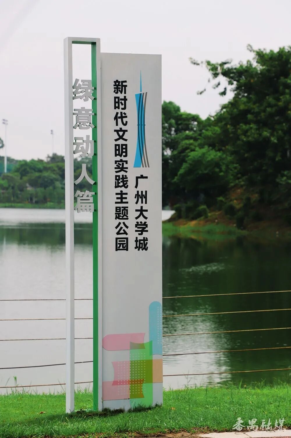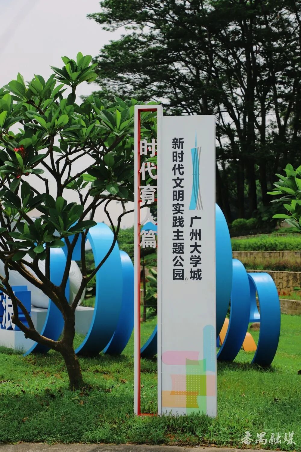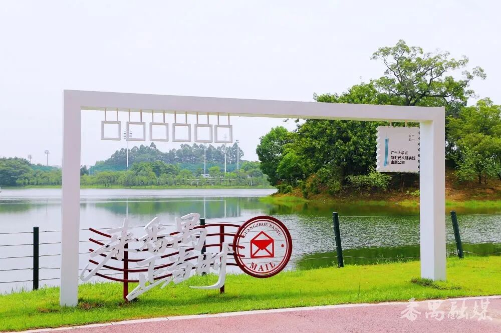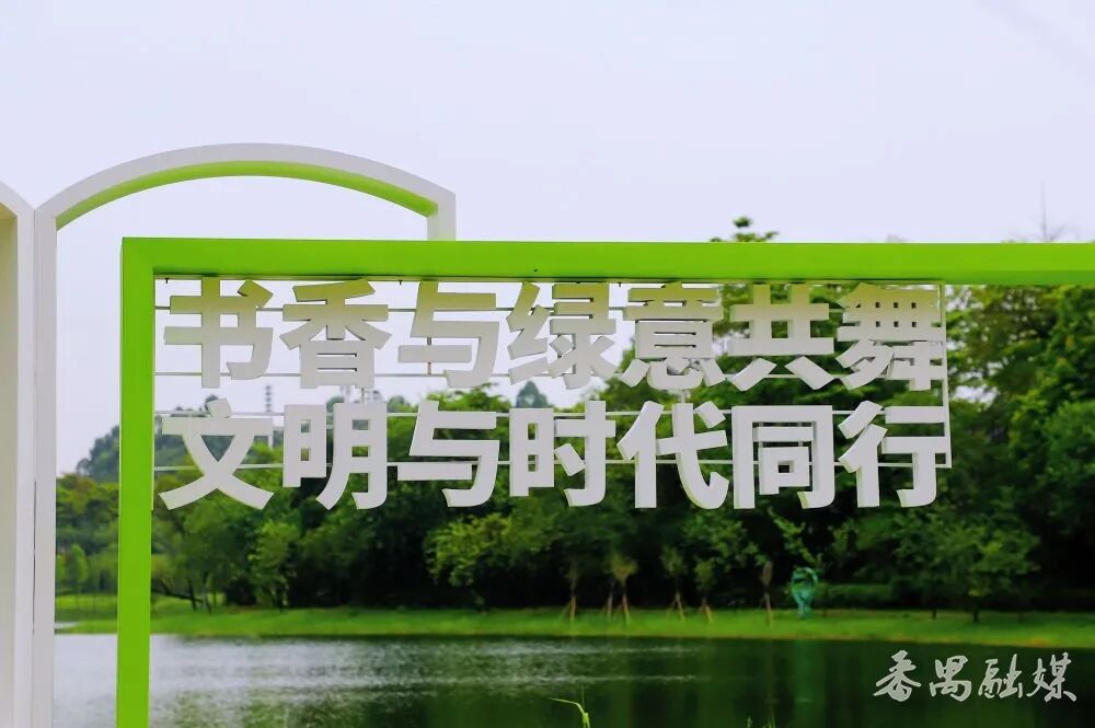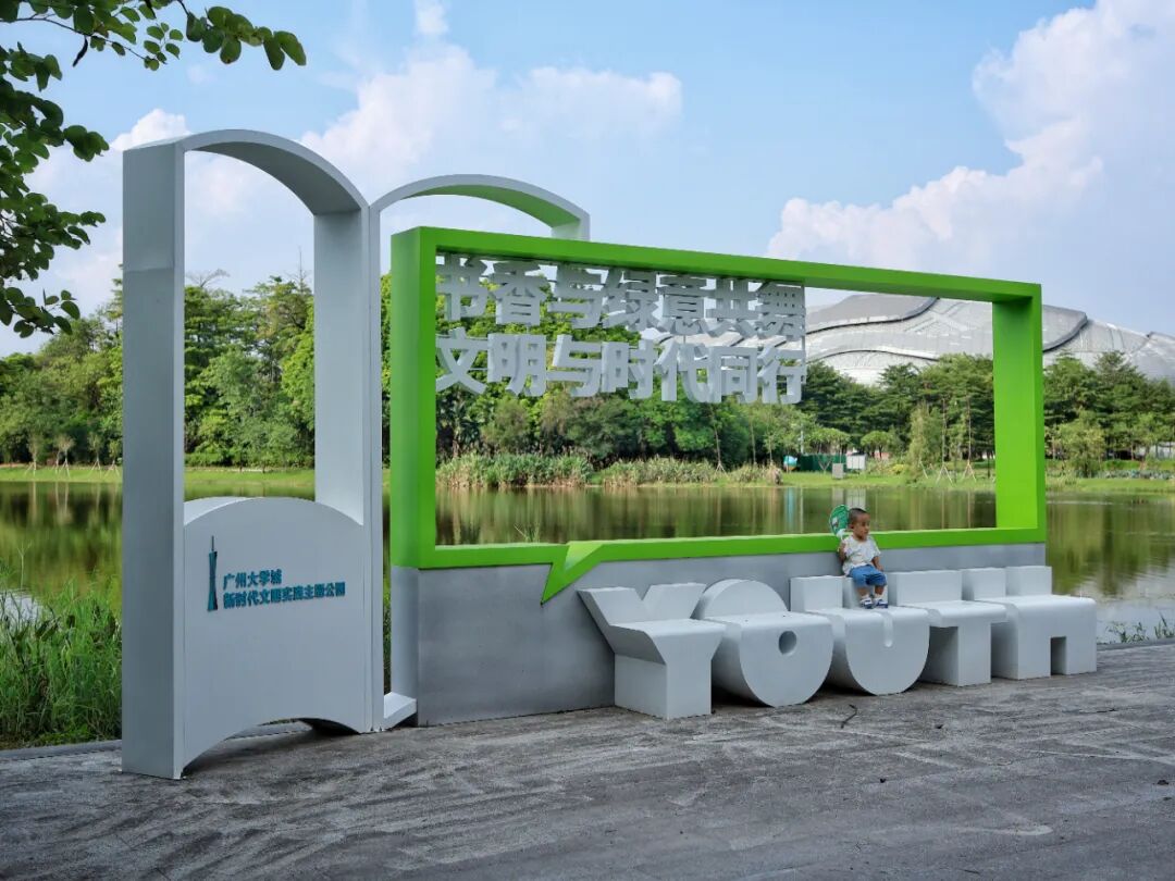 一入园,以蓝色为主色调的“广州大学城新时代文明实践主题公园”入口标识字便撞入眼帘。字体底座藏着小心思——“人字形”书本托举着文字,暗合“以人为本”理念和广州大学城的育人初心;融合勾勒的岭南屋檐弧度,又把番禺的古早记忆轻轻叠进现代工艺里。站在标识前,像是翻开了一本会呼吸的书,幽幽的墨香穿越古今氤氲萦绕,久久不散。