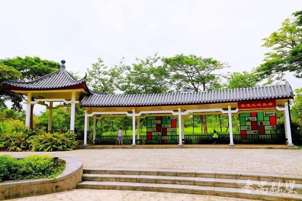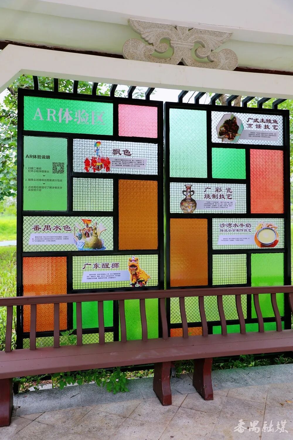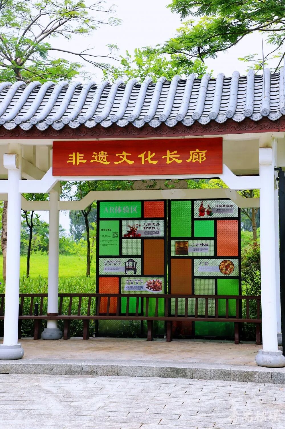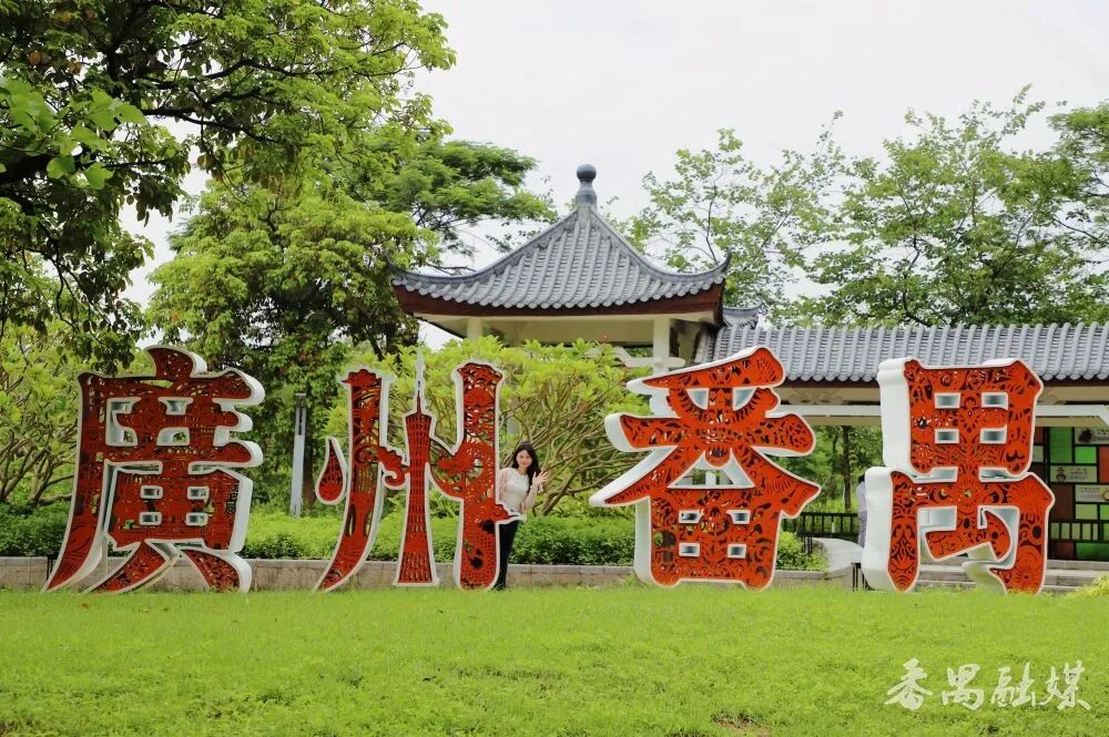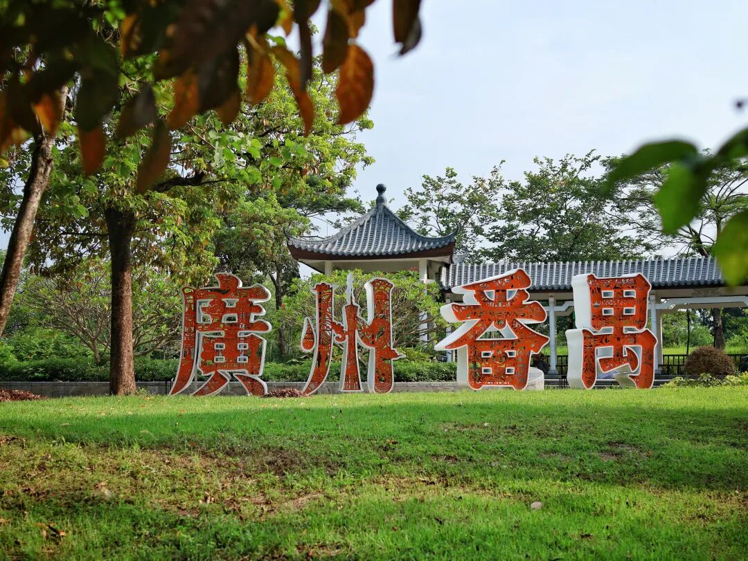 在非遗文化长廊入口,“广州番禺”四个镂空立体字静静矗立,字里藏着非遗剪纸的纹理,细节之处尽显匠心。阳光穿过时,地面投下细碎的花影,极具视觉美感。透过字体缝隙拍摄后方景致,或站在字前留影,都能拍出富有番禺文化韵味的照片。