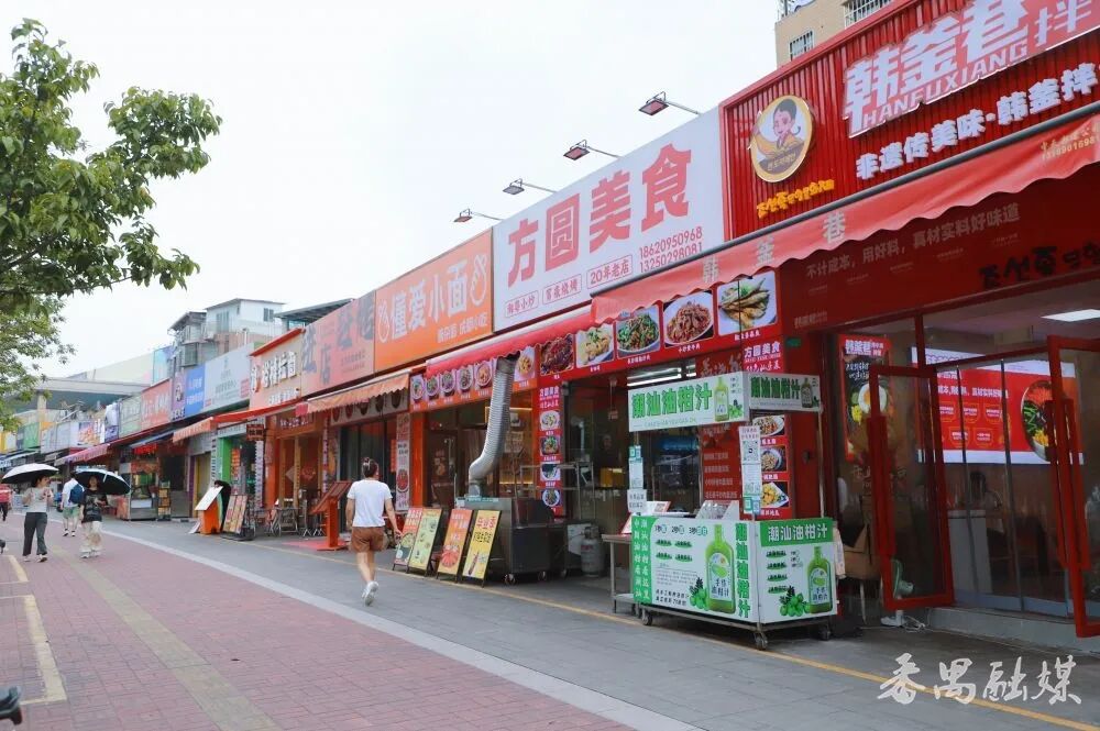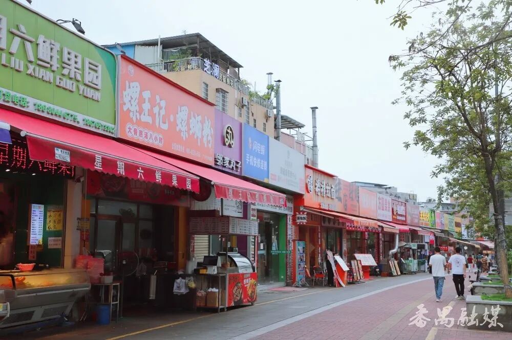 下一站是小谷围街贝岗村,这里是广州大学城最有烟火气的地方,也是文明新风与市井烟火的交融处。街道两旁,小吃摊和餐馆林立,将整条街道衬托得烟火气满满。各种食物香气弥漫,有烧烤的孜然香、螺蛳粉的酸香、奶茶的甜香、猪脚饭的鲜香……这里汇聚了天南地北的美食,贵在实惠。还有gogo新天地商圈,一站式满足学生的吃逛需求。