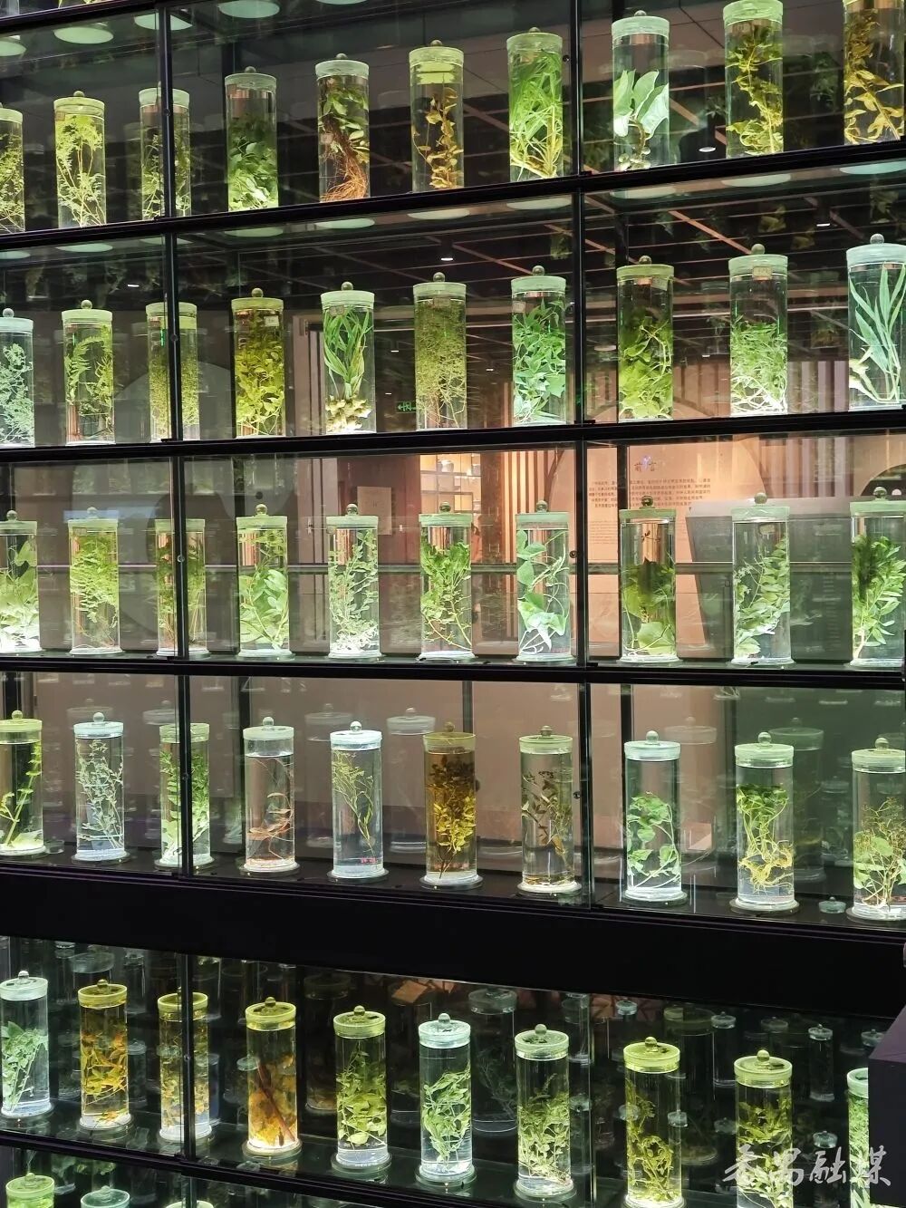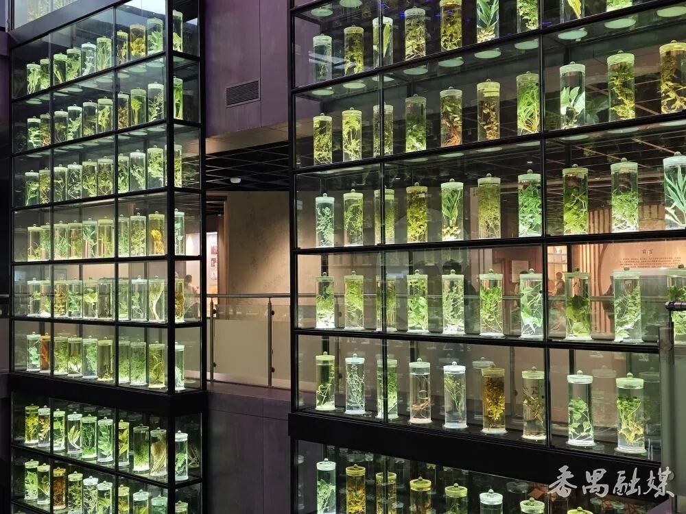 走进博物馆,数百个玻璃标本瓶组成中药水晶墙,每一瓶都装着不同的植物标本,木棉花、何首乌、沉香……这可都是入药的好材料。在植物标本墙前拍照,那些泛着淡淡绿光的中草药,把《本草纲目》的文字变成了可见的美。