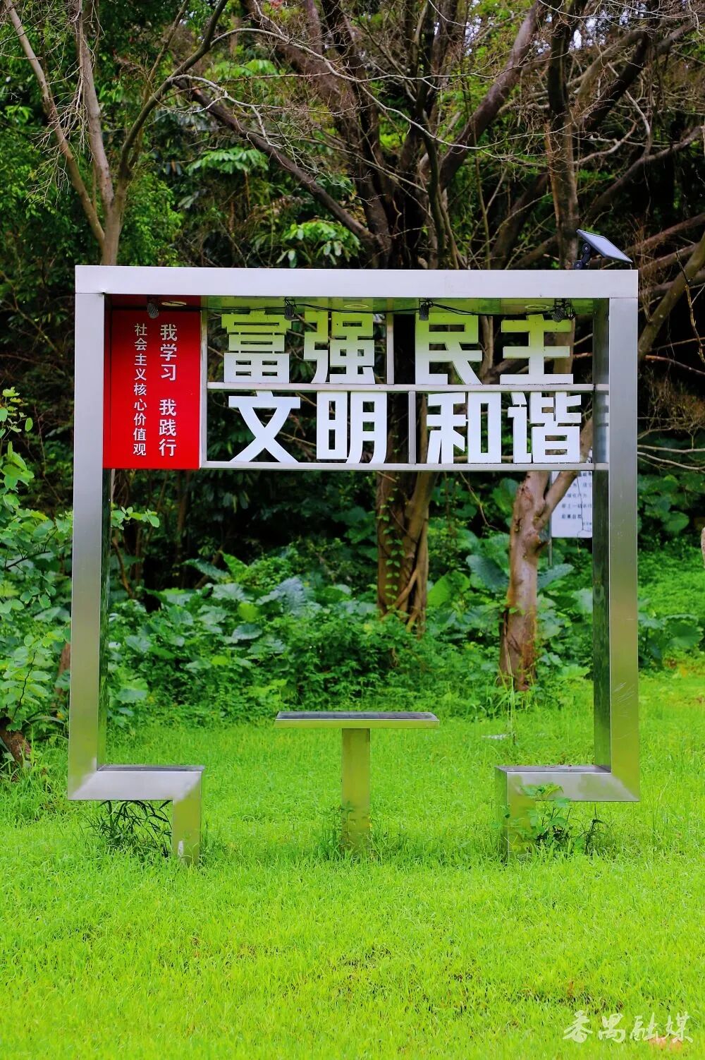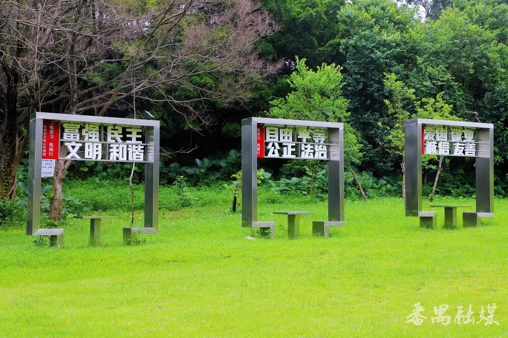 再往前点,湖边草地上的三套桌椅极为特别。“富强民主文明和谐”等字眼悬挂在桌椅上方,将社会主义核心价值观自然地融入休憩设施和生态空间。坐下来时,望着波光粼粼的湖面,对价值观的理解仿佛在美景的映衬下更加生动具体。桌面上的中国象棋棋盘更是天然的社交场,不管老少,都可以带上象棋切磋一二,传统文化就这样混着青草香钻进心里。