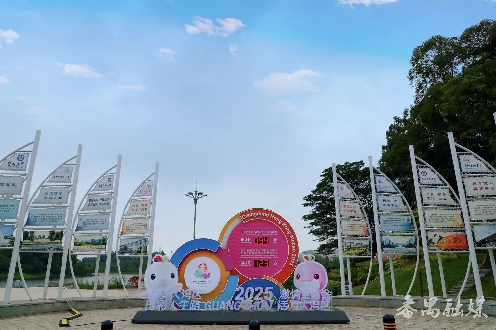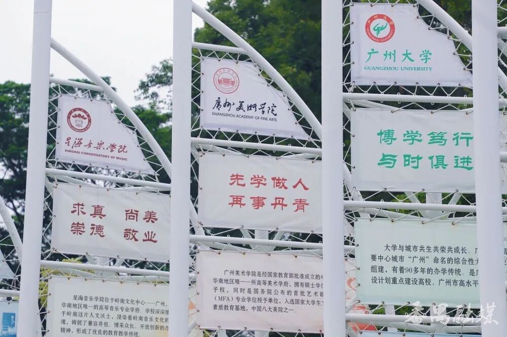在公园入口另一侧,广州全运会倒计时装置两边,12片风帆排成八字,像一群随时要起航的帆船。每片风帆上都印着广州大学城高校的办学特色、校规校训。华工的“博学慎思 明辨笃行”、暨大的“忠信笃敬”、广美的“先学做人 再事丹青”……风过时,帆叶轻轻晃动,仿佛能听见12所高校的青春誓言,又好似看见万千学子正扬起理想的风帆,乘风破浪的豪情壮志油然而生,激励人心。