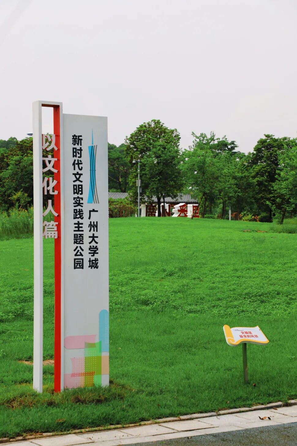 临近出口,社会主义核心价值观亭站构成又一标志性景观,游玩累了可以在此稍作休息。公园出口处,红白色的出口标识字在开阔的绿荫草坪上舒展着,左边的广州塔模型与其相互映衬,既指引着出口的方向,又将城市地标嵌入这方园景中,很适合拍摄集体照或作为背景留念,还可以用作开展草坪音乐会、草坪公益课、周末文明集市等活动。站在此处,回望这片绿意盎然的文明阵地,深感其设计之用心、内涵之丰富。