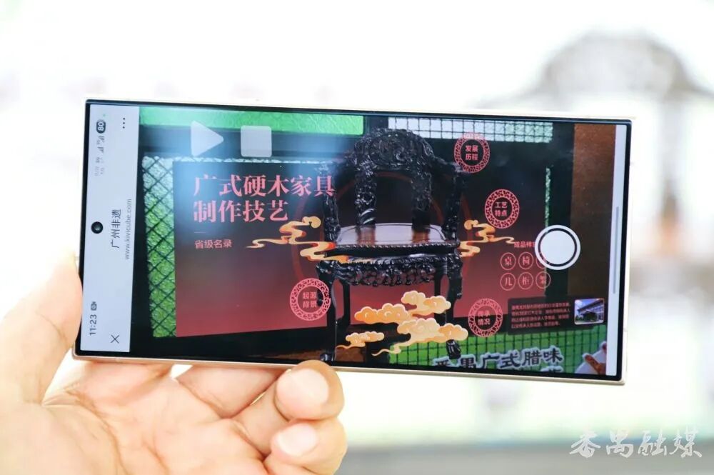走进非遗文化长廊,满洲窗的彩色琉璃映照着岭南特色的建筑,成为游客歇脚的好去处。长廊里的AR体验区叫人眼前一亮,掏出手机扫码,AR技术立刻让广绣的精美纹路、粤剧的华美服饰等非遗跃然屏上,通过点击屏幕,还可以查看非遗的分布起源、技艺特色、传承情况等资讯,这种沉浸式、互动式的体验,让传统与科技撞了个满怀,原来非遗可以这么潮!