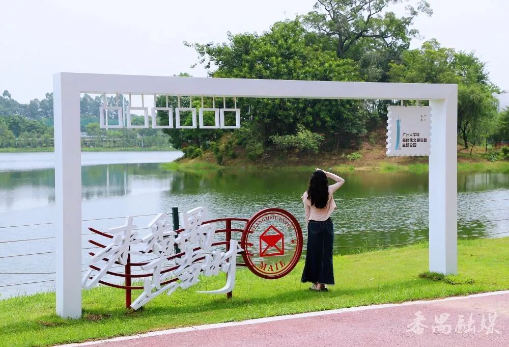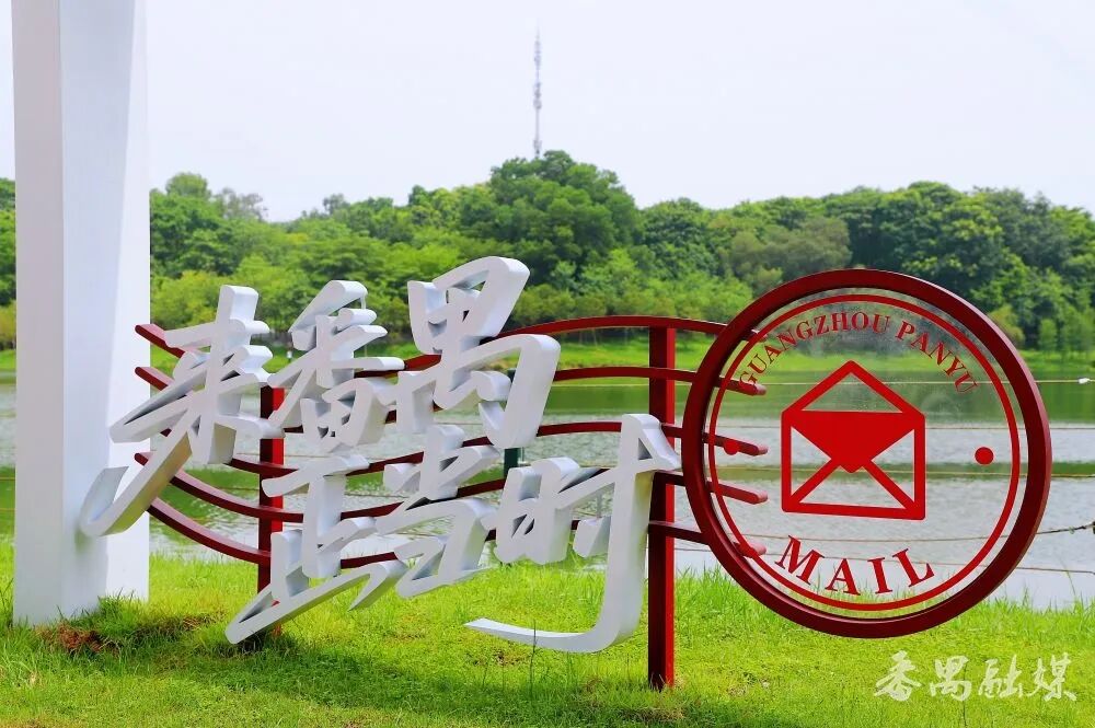 离开人才广场,沿着湖畔漫步,“来番禺 正当时”明信片造型打卡点跃然眼前。该设计还原明信片细节,配有邮票、邮戳图案,“来番禺 正当时”的白色字样点缀于左下方。这里是绝佳的拍照打卡地,可以站在明信片中央,背景是优美的湖景,定格瞬间,仿佛将番禺的此刻美好都塞进信封,寄给未来的自己或远方亲友,趣味盎然,仪式感满满。