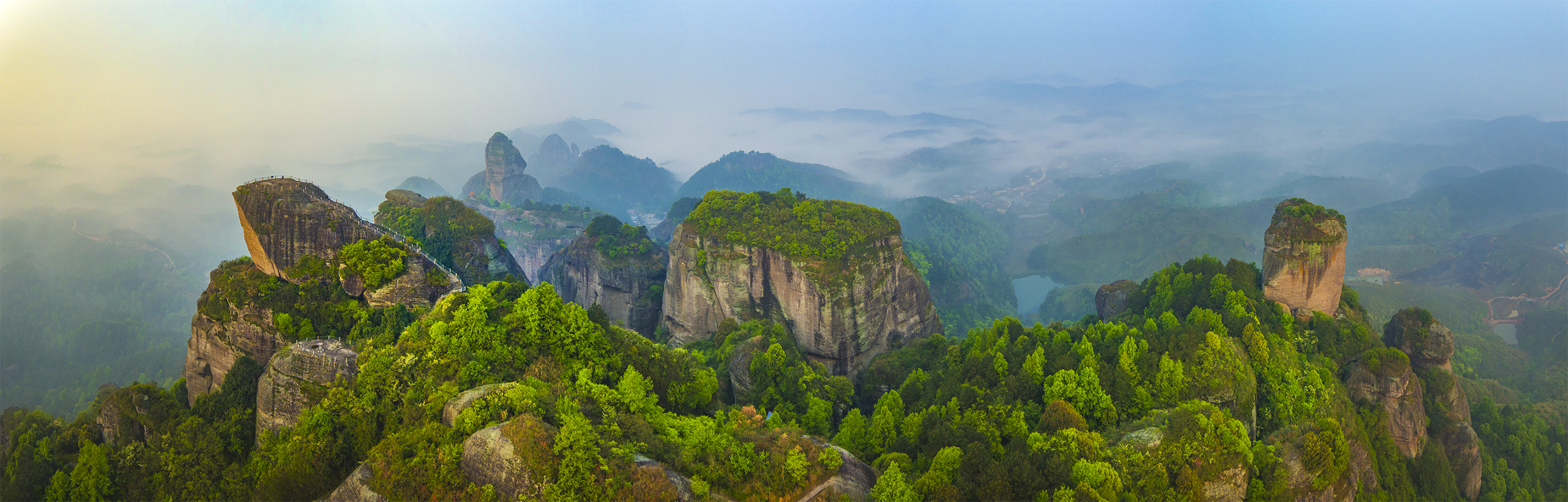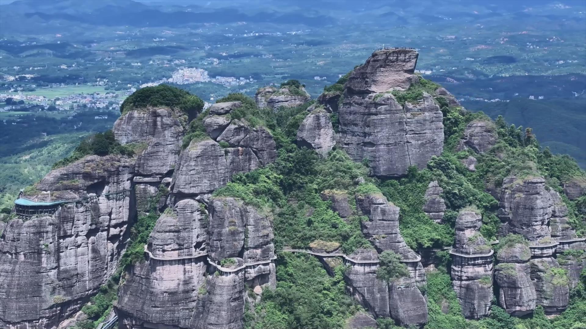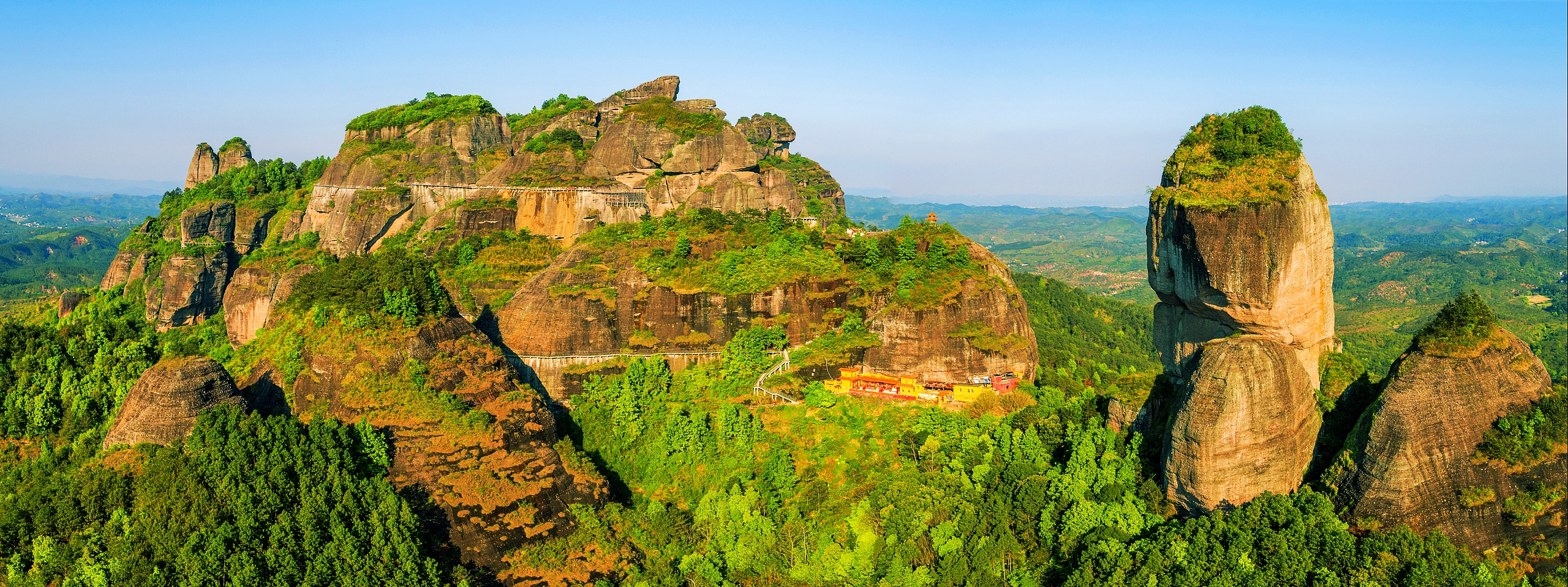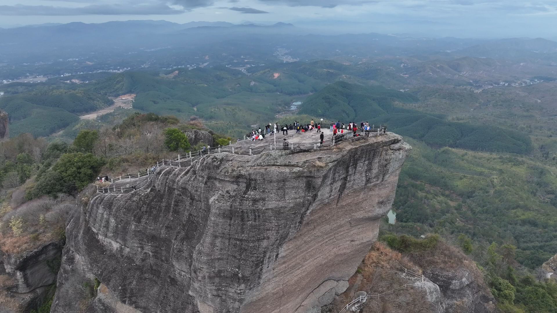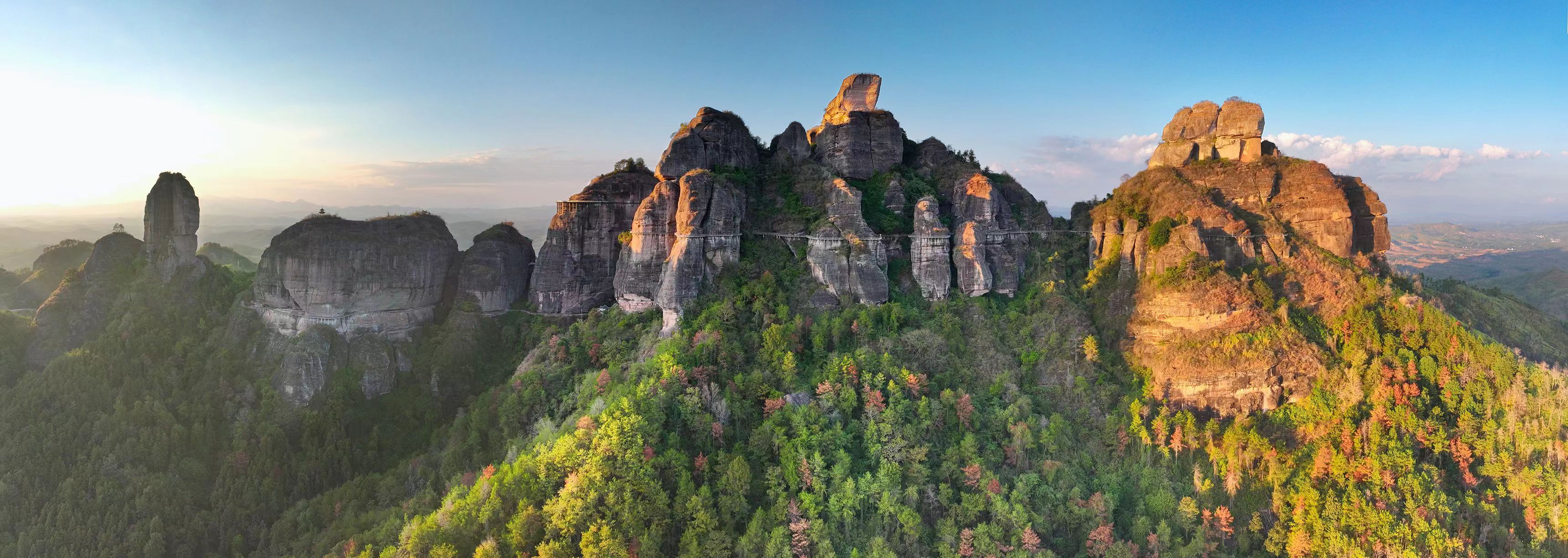 粤东的丹霞地貌并不多见,霍山便是其中最著名的一处。它发育完整,山体高耸,在田心、石坑、铁场三地交界的低矮盆地中拔地而起,以三组峰峦构成整体,峭石峥嵘、千姿百态,兼具秀丽景色与磅礴气势。