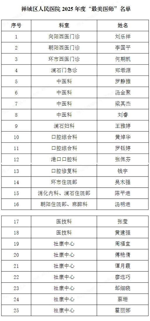 在第8个医师节来临之际,佛山市禅城区人民医院组织2025年度“最美医师”评选活动,经过群众推荐和评委会投票多个环节,最终产生25名“禅城区人民医院最美医师”名单,以下为详细名单: