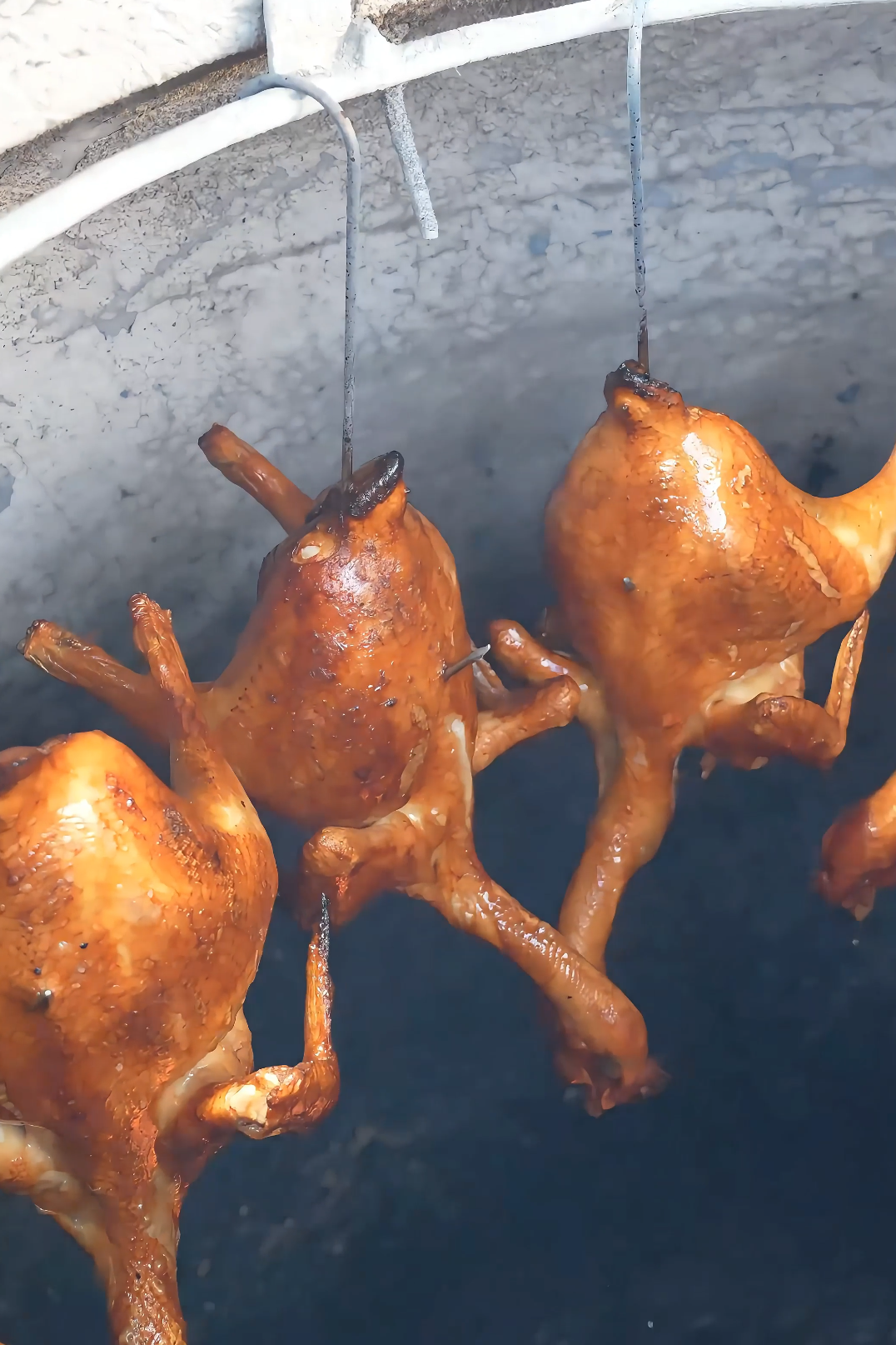 开始烤制后,李道红游走在三个瓦缸之间,不时翻开盖子查看缸内火候情况,加入木炭保持火力。经过近300℃的高温烤制,现腌现烤新鲜出炉的烤鸡外皮酥脆,肉质鲜嫩多汁。