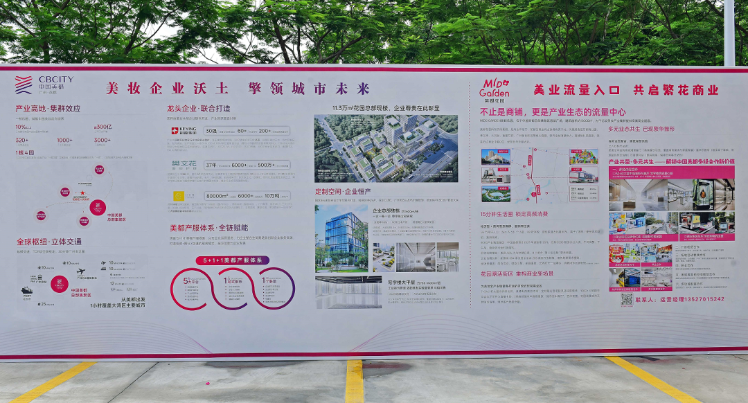 区域内已形成密集的化妆品产业生态圈,半小时辐射圈内集聚化妆品制造企业超1000家(花都区超320家,白云区北部江高镇、人和镇超500家、清远市清城区、广清园超100家、佛山市里水镇、大塘镇超100家)、品牌企业超3000家,化妆品注册备案量占全国的30%以上(花都区占12.41%),工业产值规模预计超600亿元,支持市场流通交易(零售)规模预计3000亿元,广州北三分(中国化妆品产业)天下,形成广州北部化妆品产业“新增长极”,而中国美都总部集聚区正处于这一“新增长极”的核心位置,将进一步推动产业集群的发展壮大。