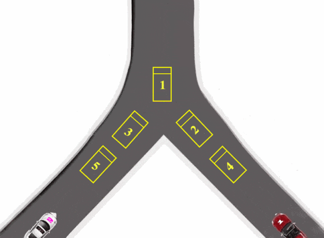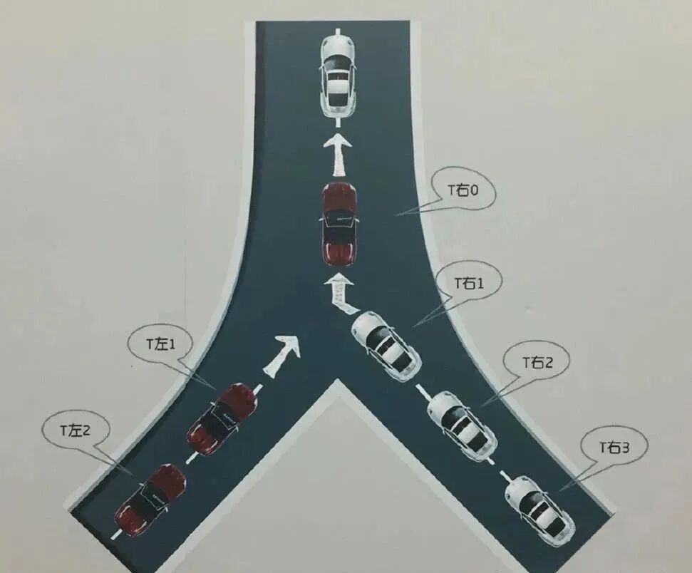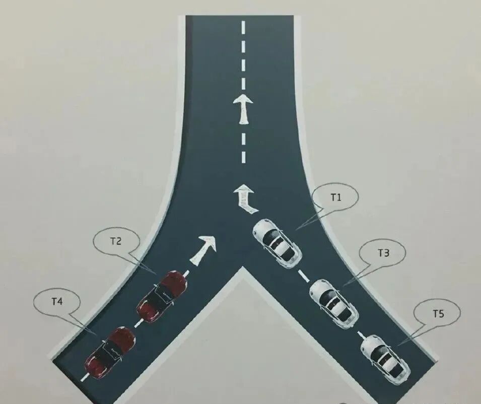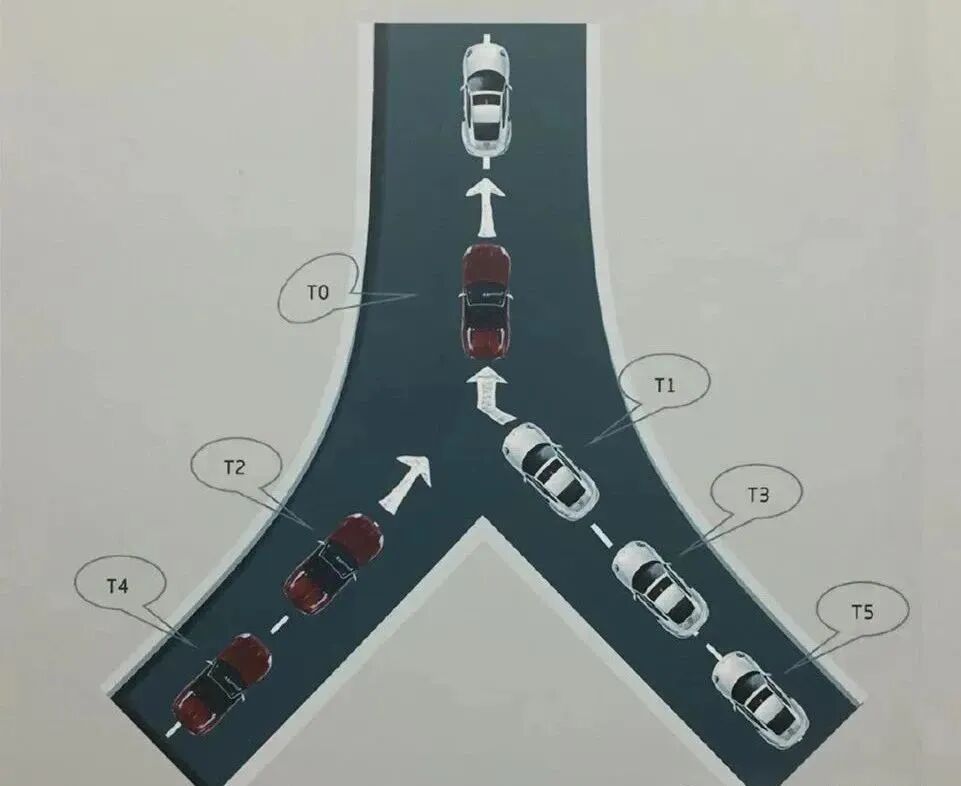 3、一侧车道车辆正常行驶,另一侧车道来车的,从同时驶入合流点的车辆开始,按照右车、左车、右车……次序依次交替通行。(注:设定为右侧车道车辆正常行驶,左侧来车驶入合流点。)