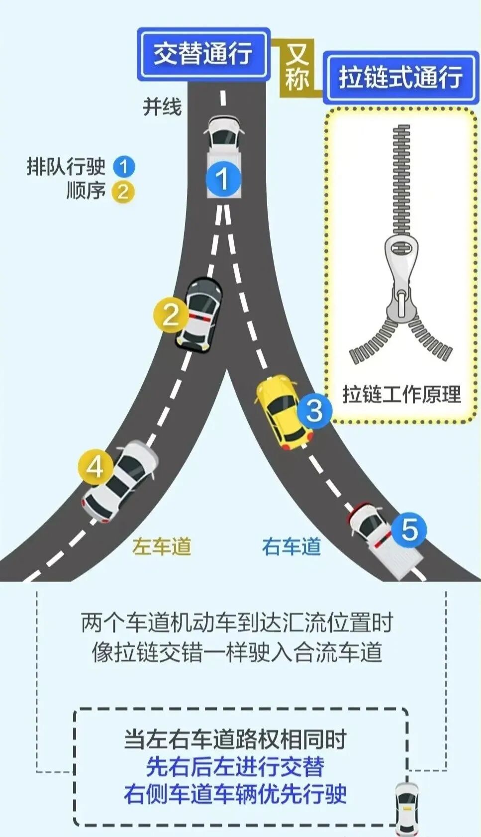 简而言之,就是“左一辆、右一辆”交替通过,互不抢行,避免了混乱和拥堵。