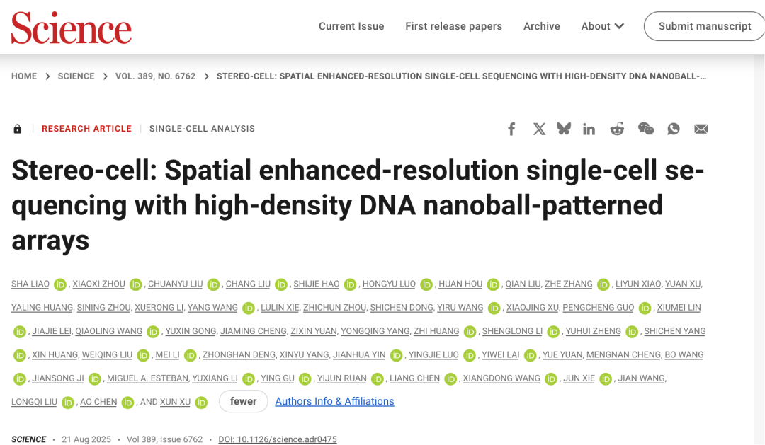 北京时间8月22日,华大生命科学研究院牵头建设的基因组多维解析技术全国重点实验室(简称“实验室”)联合多家机构,在国际顶级学术期刊《科学》(Science)发布全球领先的细胞组学技术Stereo-cell,颠覆性实现多模态整合、原位动态捕捉、极限样本兼容、百万级通量等技术突破,彻底打破了传统单细胞测序技术局限。该技术的发布标志着中国在细胞组学技术领域取得原创性引领成果,推动单细胞测序摆脱往往只能获取单一分子层面信息的“平面解析”模式,迈向兼顾多模态信息具备“立体洞察”能力的脱“单”时代,将为规模化开展细胞病理、发育与衰老、免疫与疾病、动植物遗传与进化等前沿研究提供强有力的支撑。