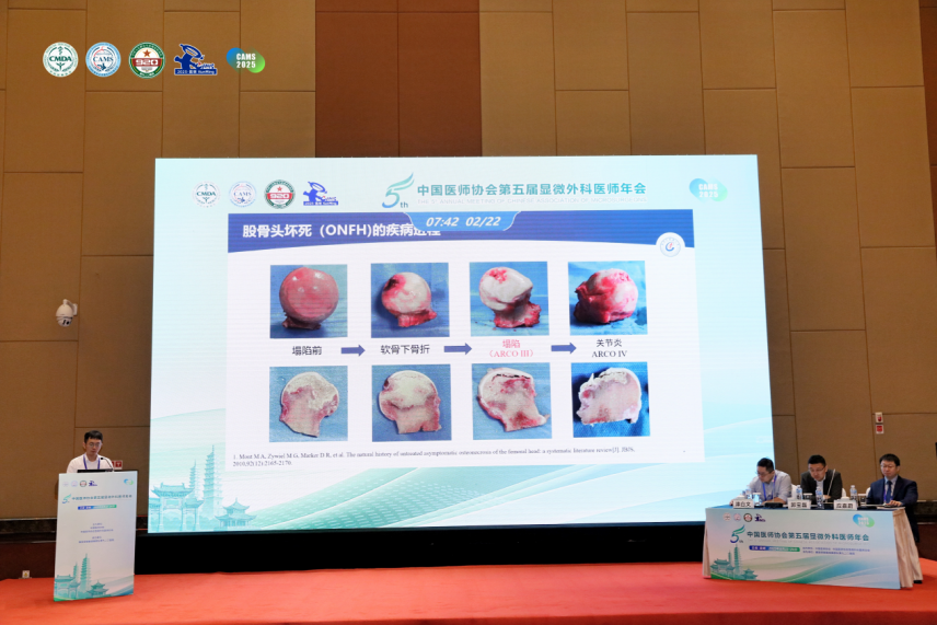 杨帆作主题为《基于“拱脚失稳”理论探索股骨头坏死塌陷性质与塌陷进展速度的相关性研究》学术报告。该研究创新性地引入工程力学“拱脚失稳”概念,阐释了股骨头结构塌陷的生物力学机制,并初步建立了塌陷速度的预测模型,为临床提前干预高风险塌陷病例提供了理论依据和新思路。