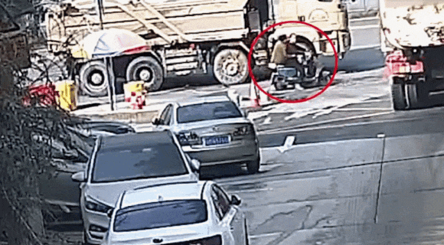 ▲大货车突然倒车,电动自行车闪躲不及被卷入车底