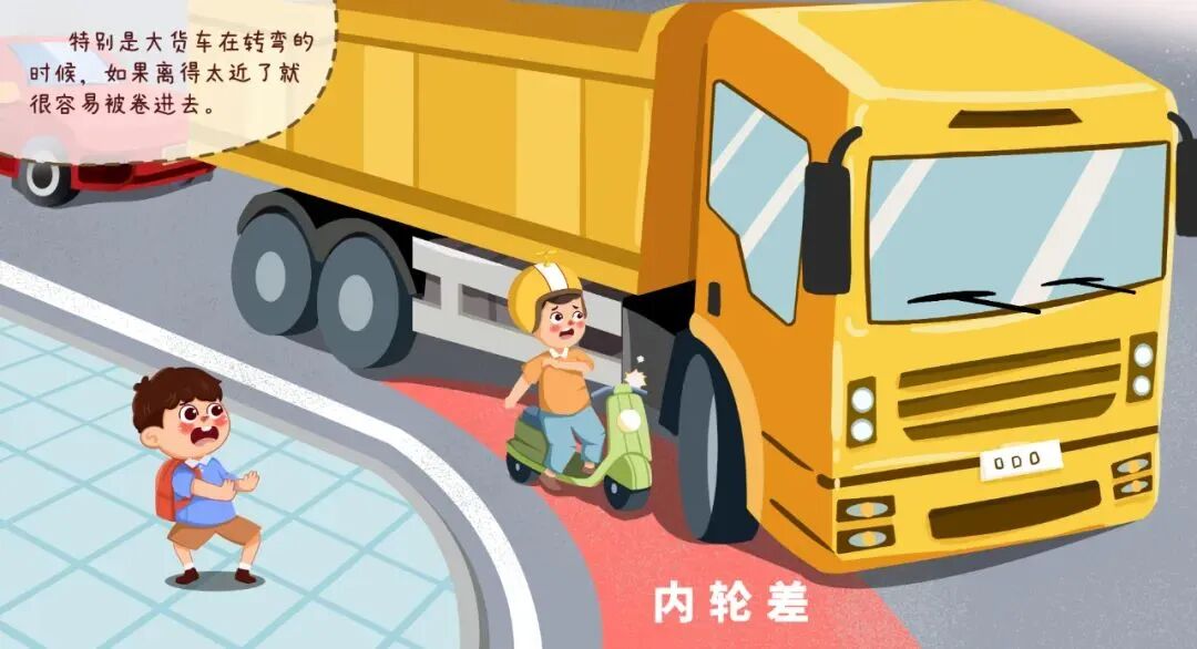 注意大型车辆内轮差,大型车辆转弯时切勿靠得太近。