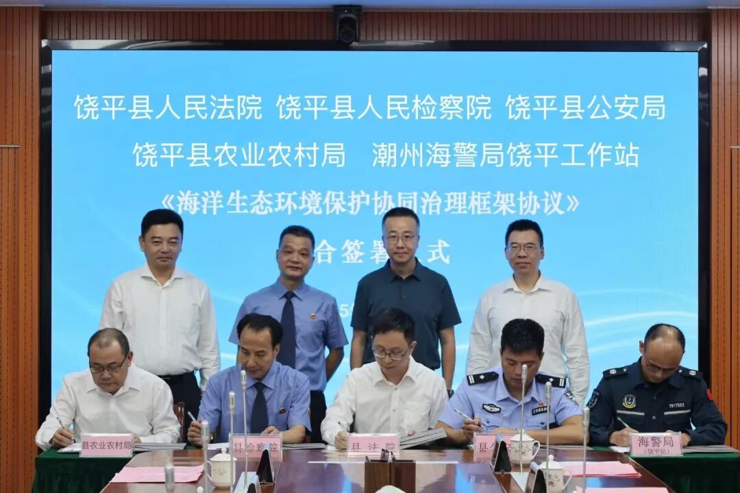 为进一步激活海域生态、经济价值,筑牢法治屏障,饶平法院协同县检察院、县公安局、潮州海警局饶平工作站、县农业农村局签署《海洋生态环境保护协同治理框架协议》,并将“海洋生态环境司法保护+‘蓝碳’司法实践点”作为协同机制落地的“前哨站”。《协议》凝聚“蓝碳”战略共识,强调对破坏海洋生态环境资源犯罪行为的依法打击,明确生态修复、修复监管、技术支持等各领域环节协作方向,持续探索符合饶平海域特色的增殖放流、贝类养殖、生蚝吊养等固碳增汇修复模式,让“禁”与“育”同向而行。